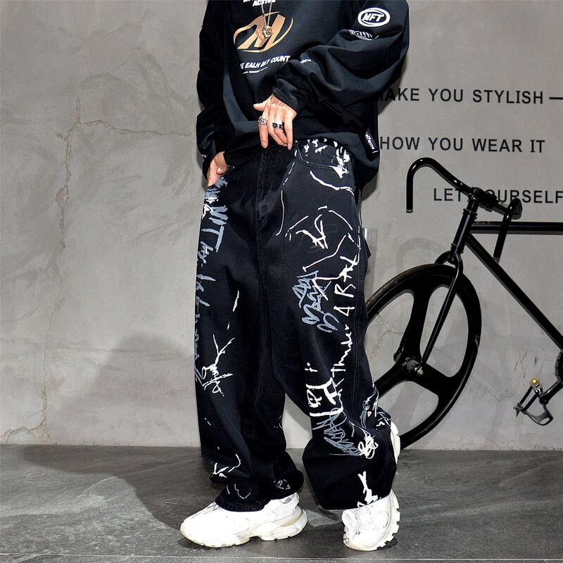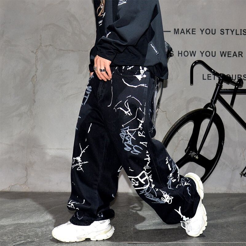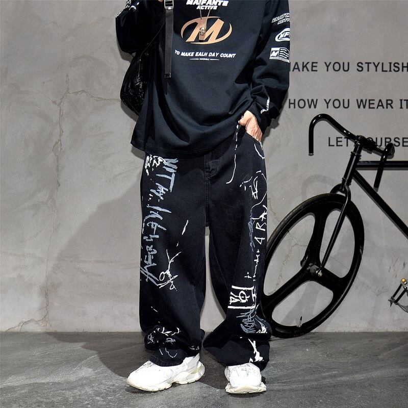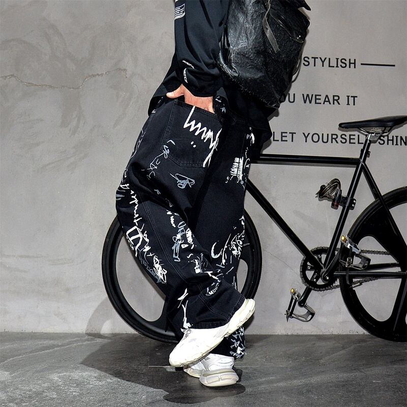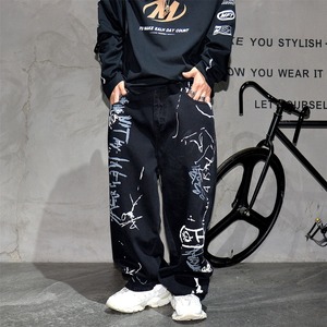 落書きヒップホップ雰囲気デニムワイドパンツ