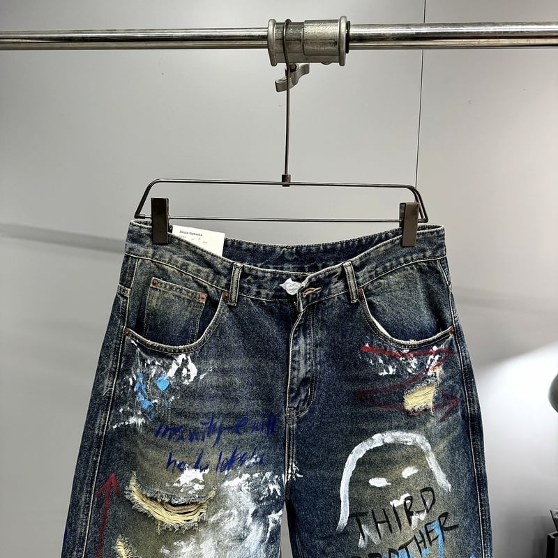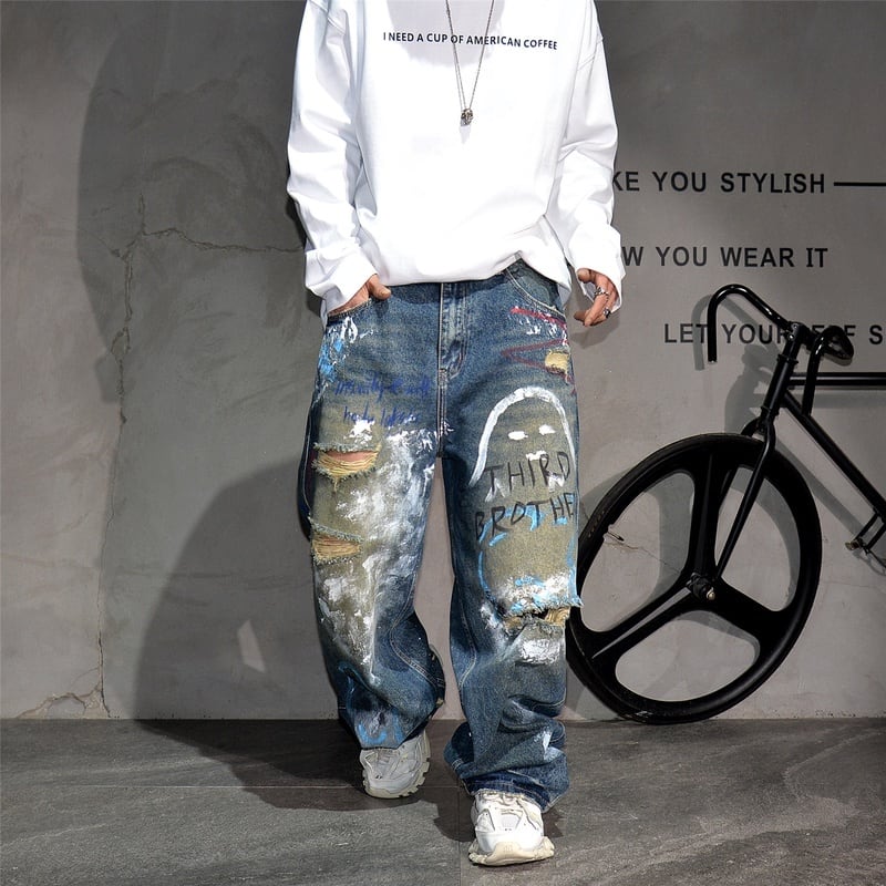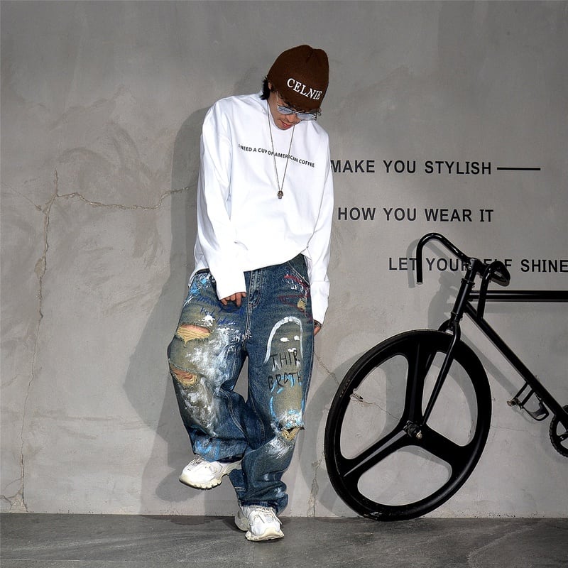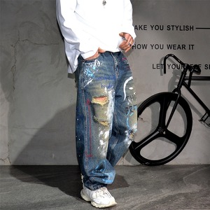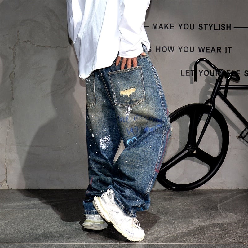 グラフィティ描くダメージ加工デニムワイドパンツ