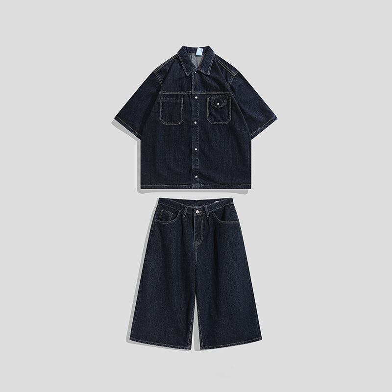 ストリートデニム半袖シャツ&ハーフパンツ2点セット