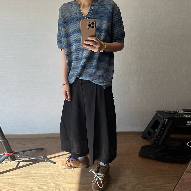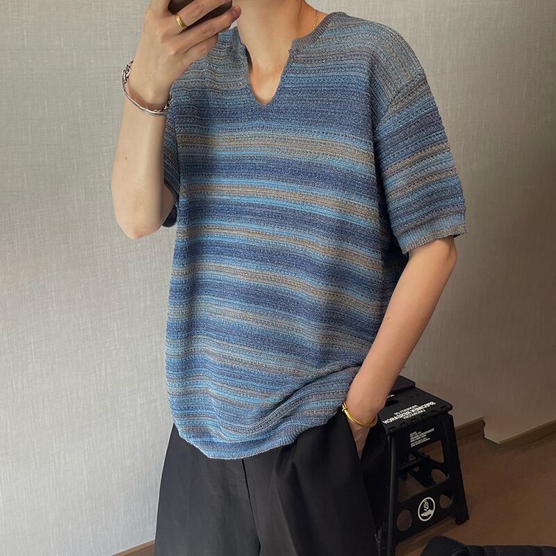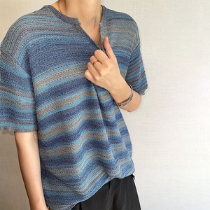 dannyandzeeグラデーションボーダー柄Vネックニット半袖トップス