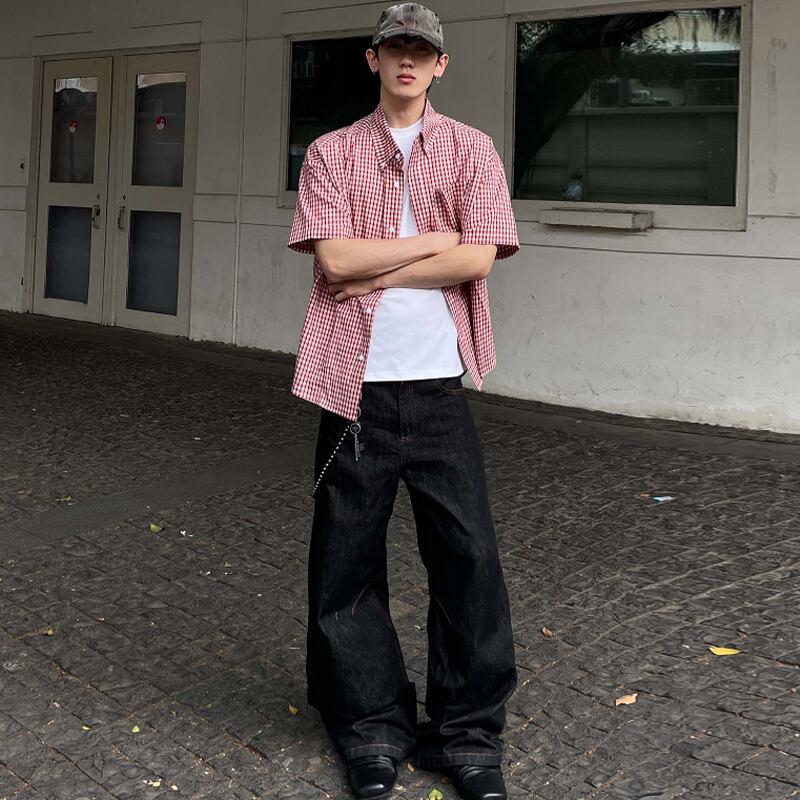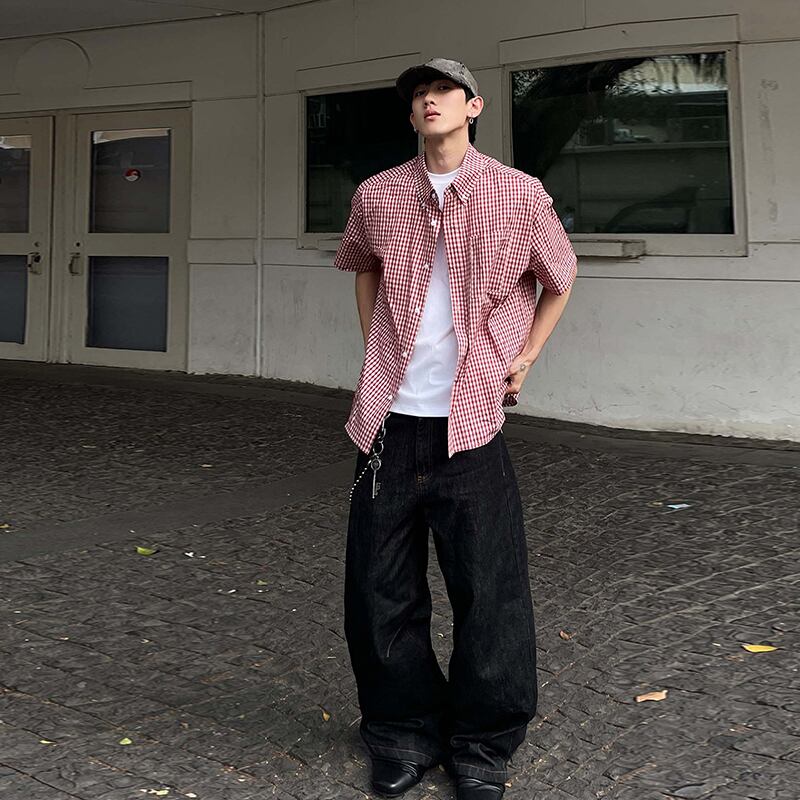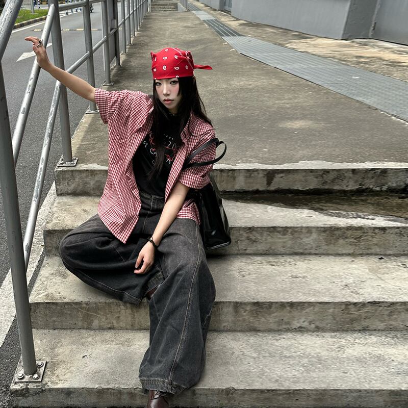 FLEE GFN鮮やかな赤チェック柄半袖シャツ