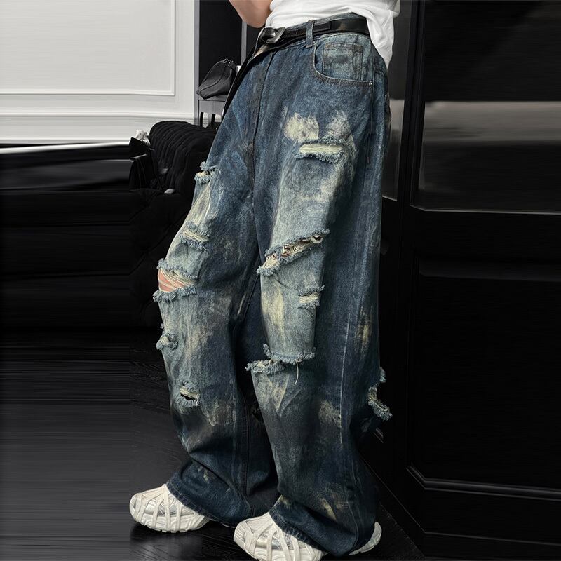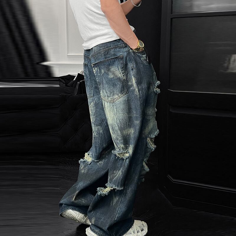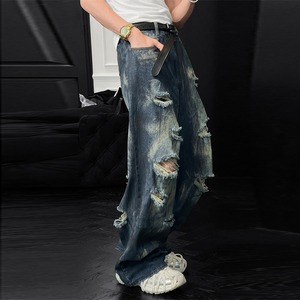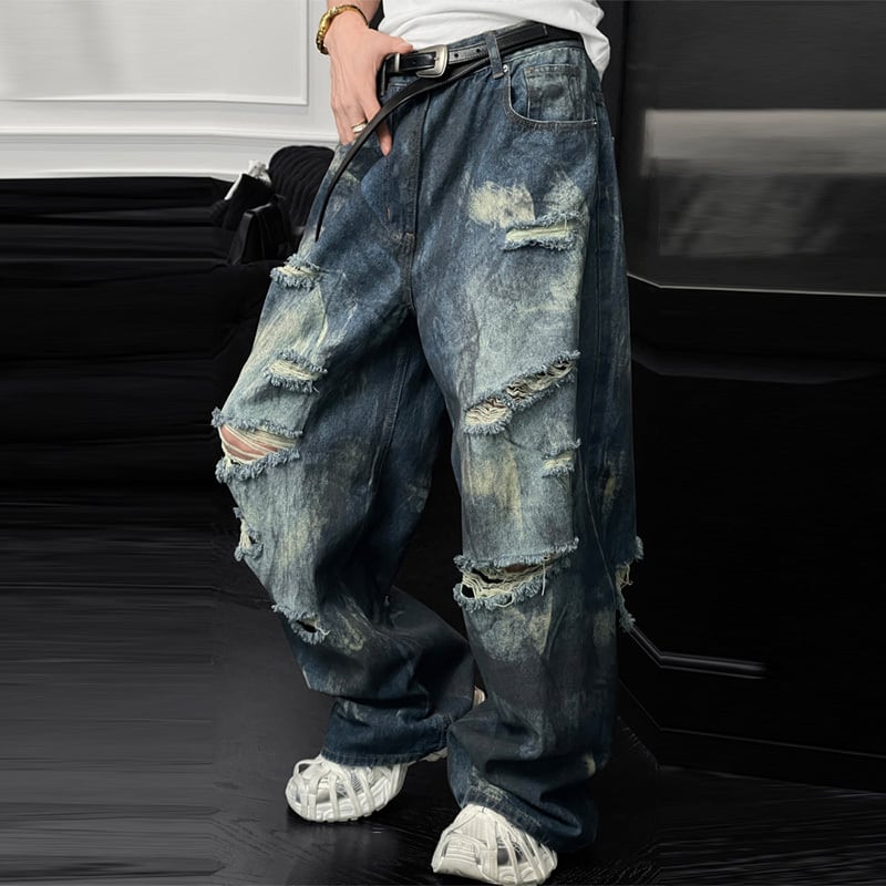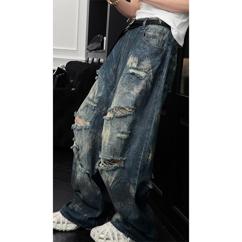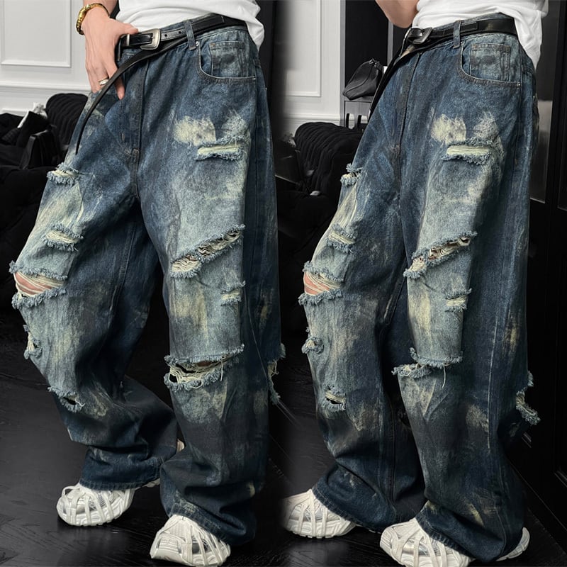 LDDビンテージ加工ダメージ入りデニムワイドパンツ