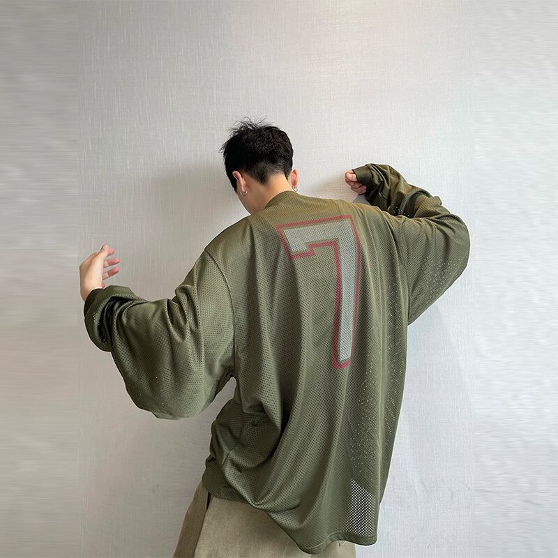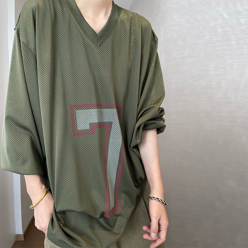 dannyandzeeミリタリーグリーンメッシュVネック長袖Tシャツ