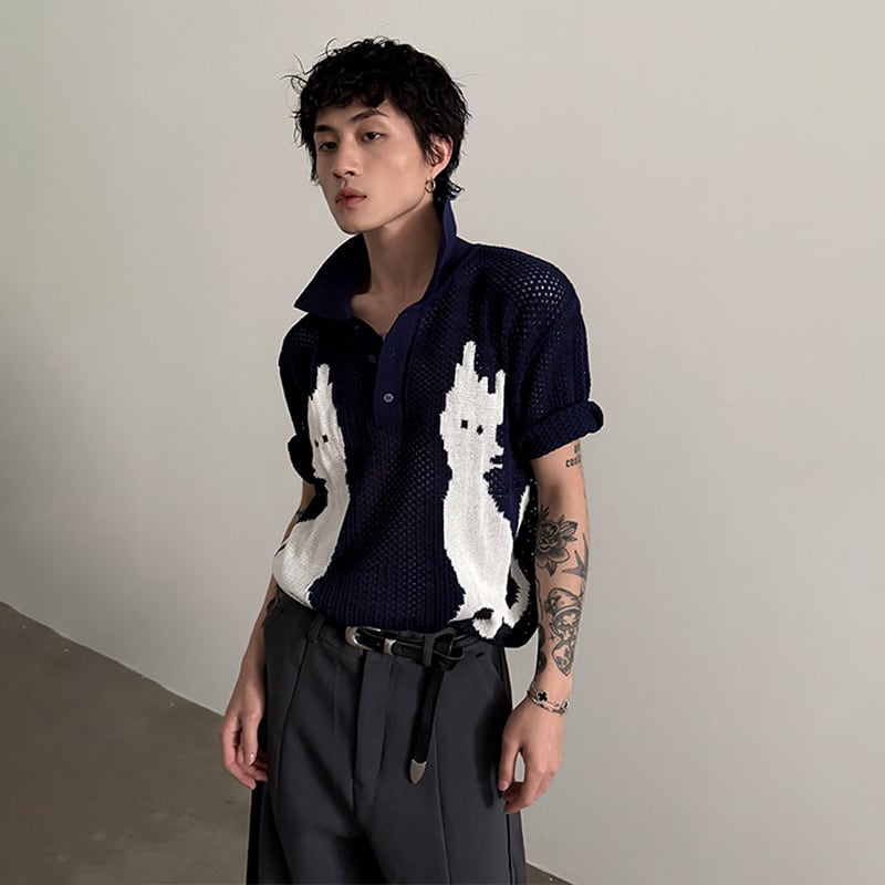 VERY FEWEST猫モチーフ無地カラーメッシュポロシャツ