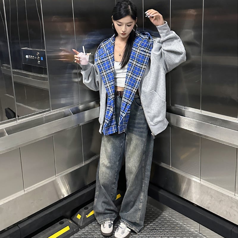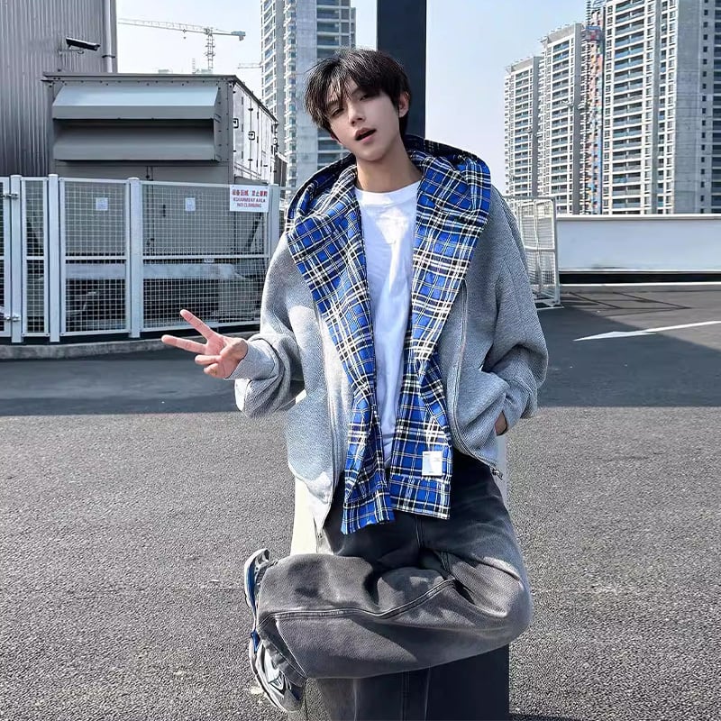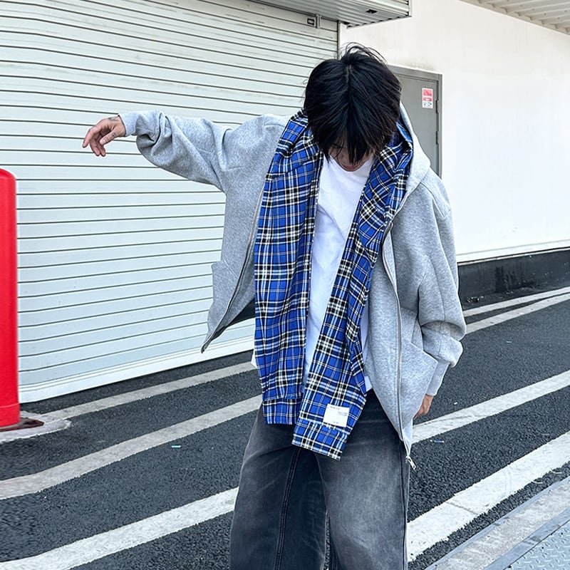 SHAKEYU重ね着風ジップアップフード付きパーカー