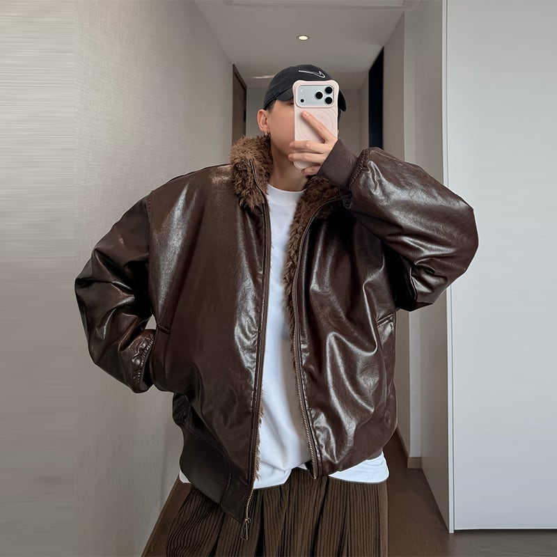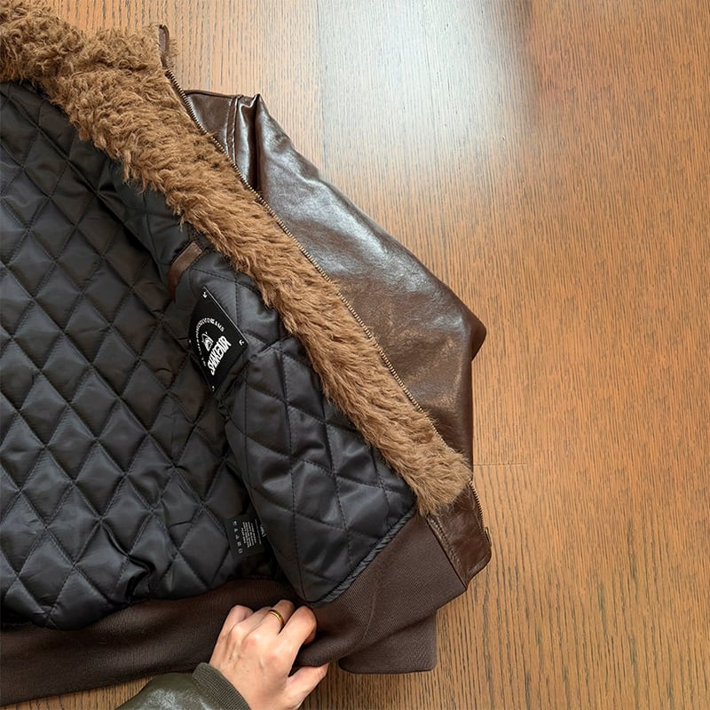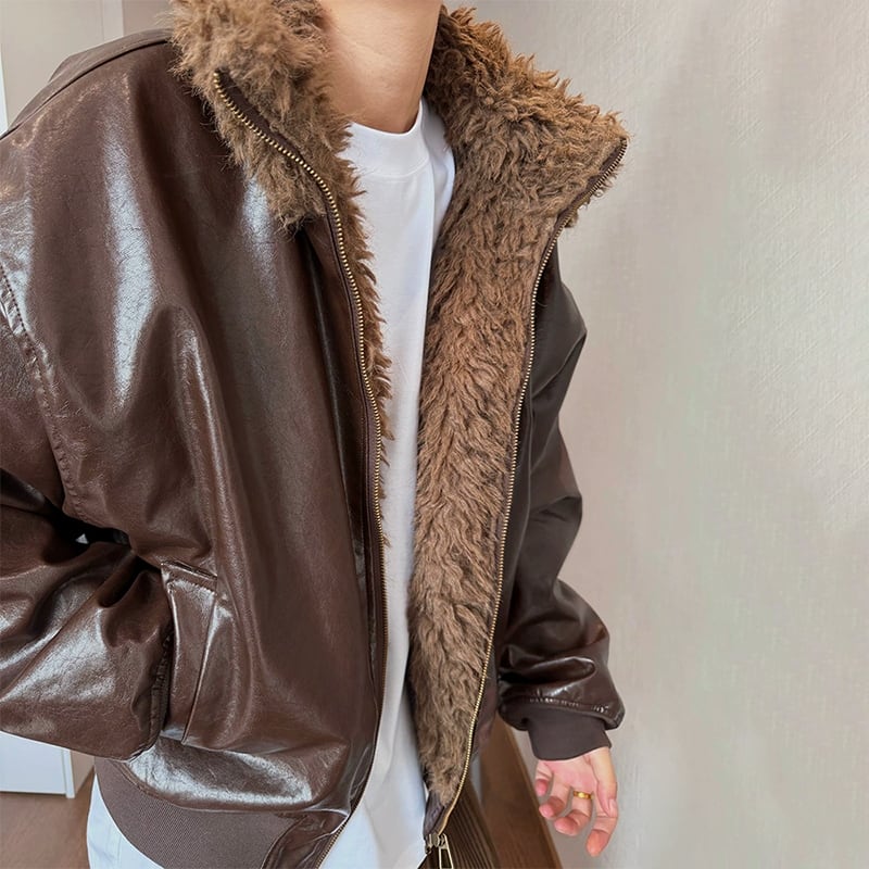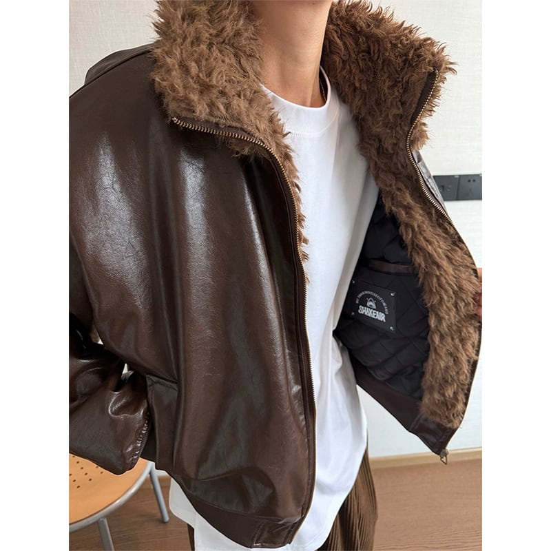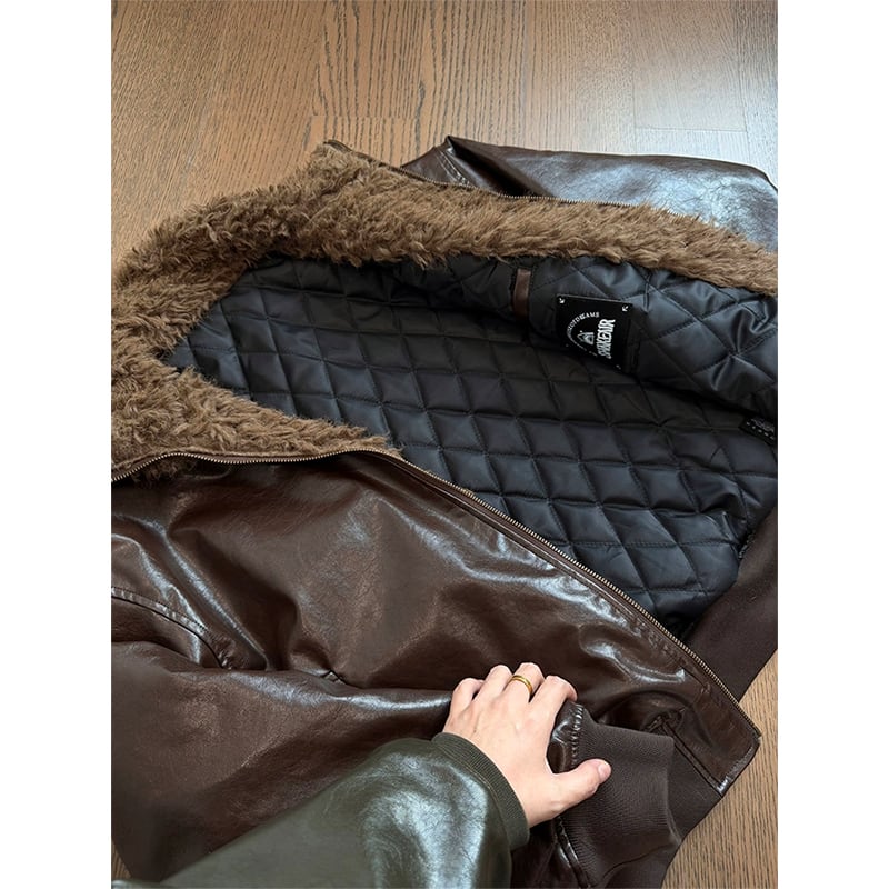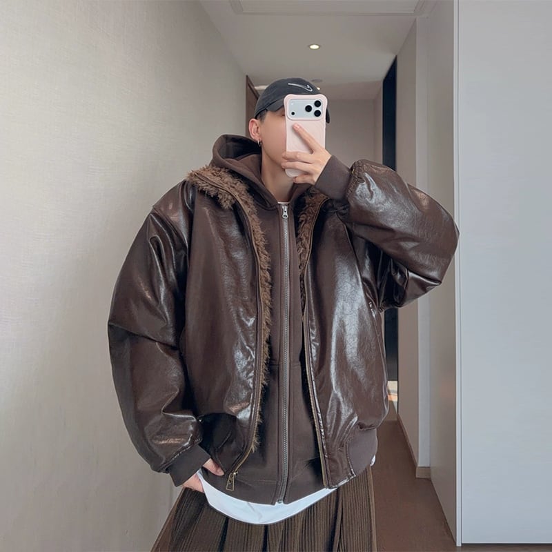 dannyandzeeオイルドレザー風コーヒーPUファージャケット