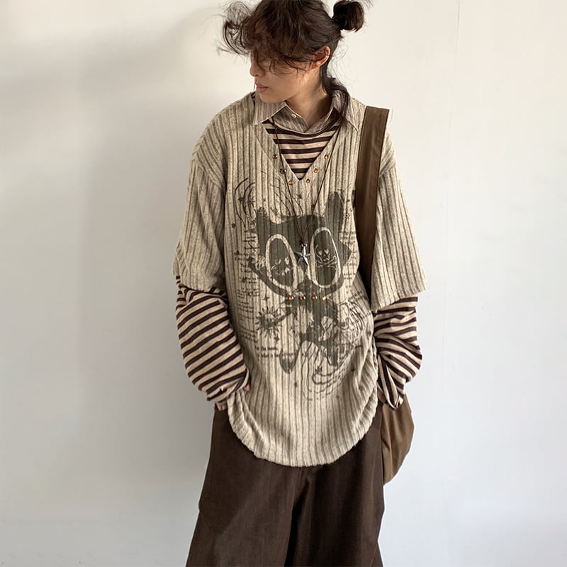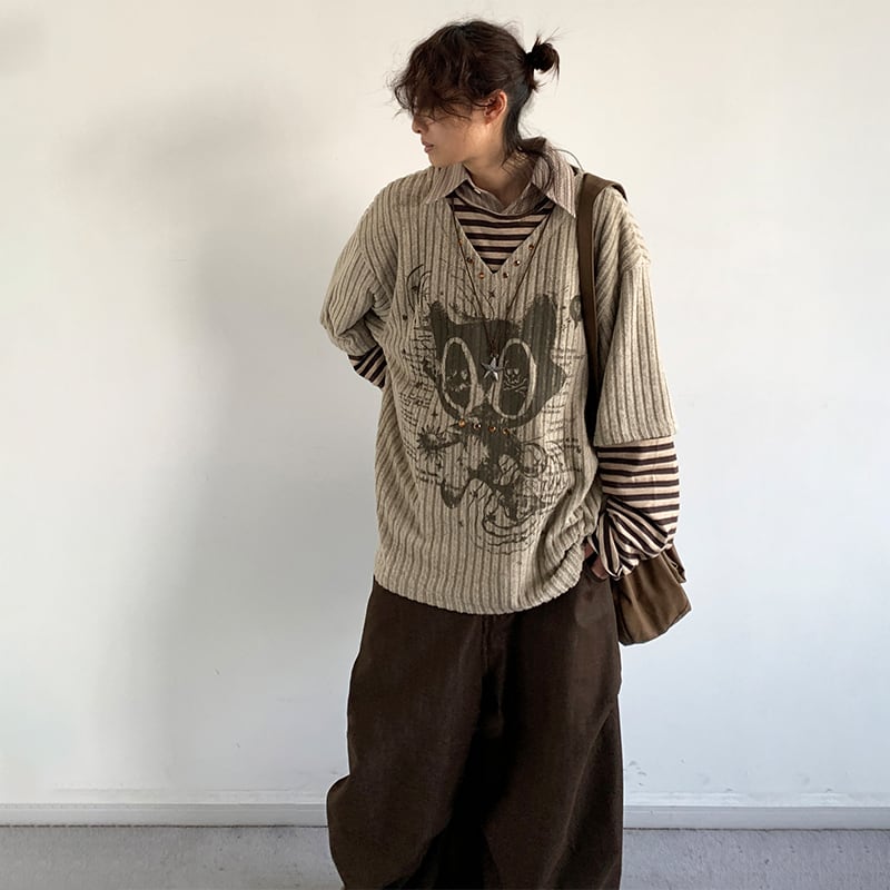jiwuusビッグシルエット猫デザイン長袖トップス