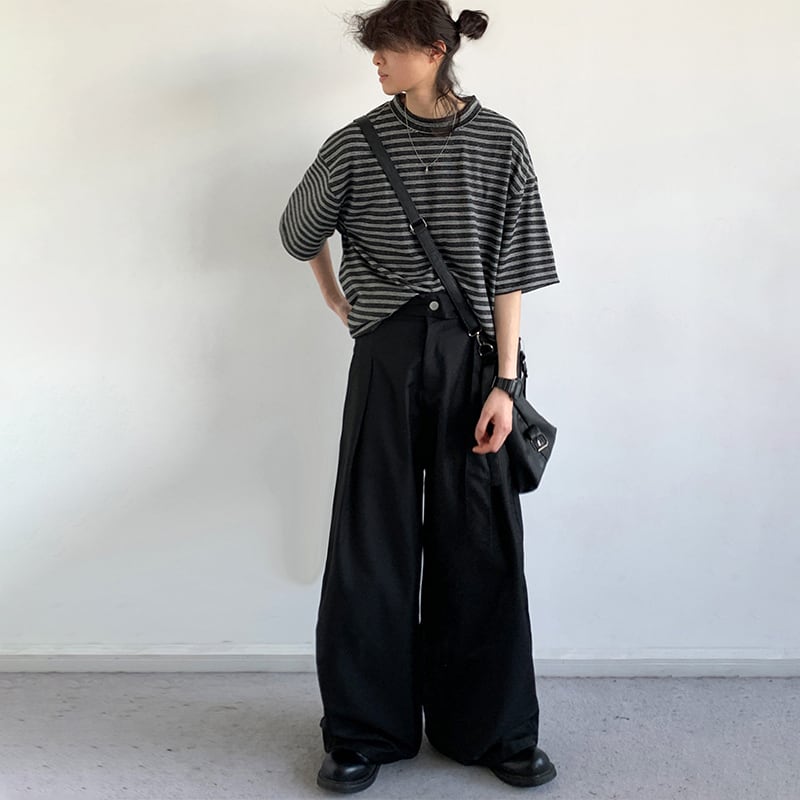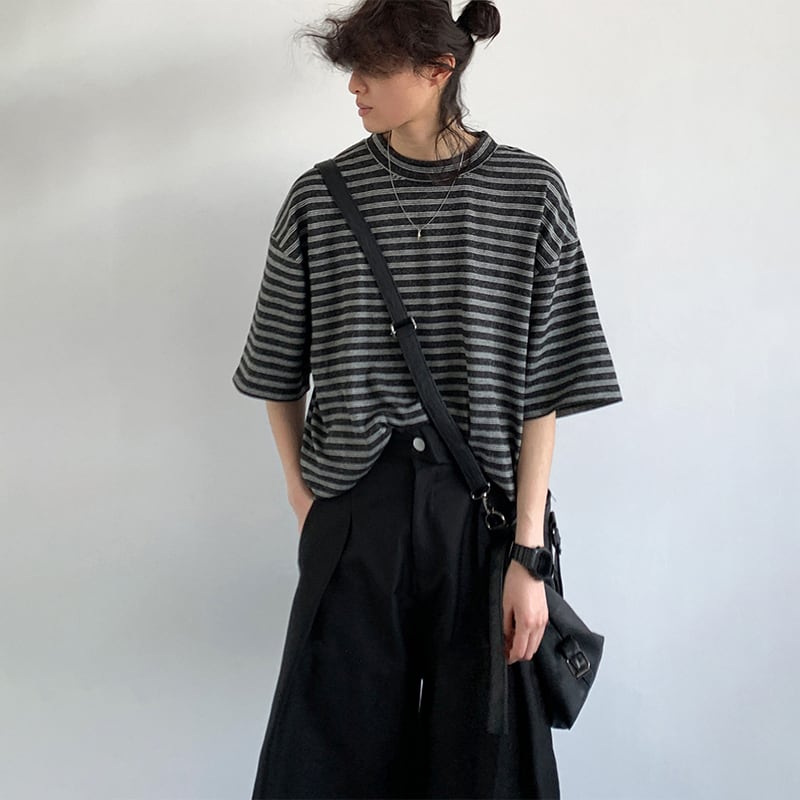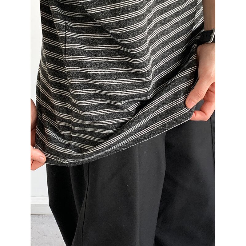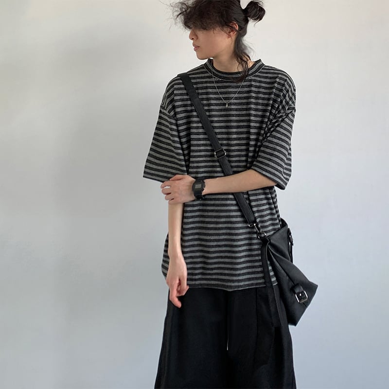 jiwuusシンプルボーダーラウンドネックTシャツ