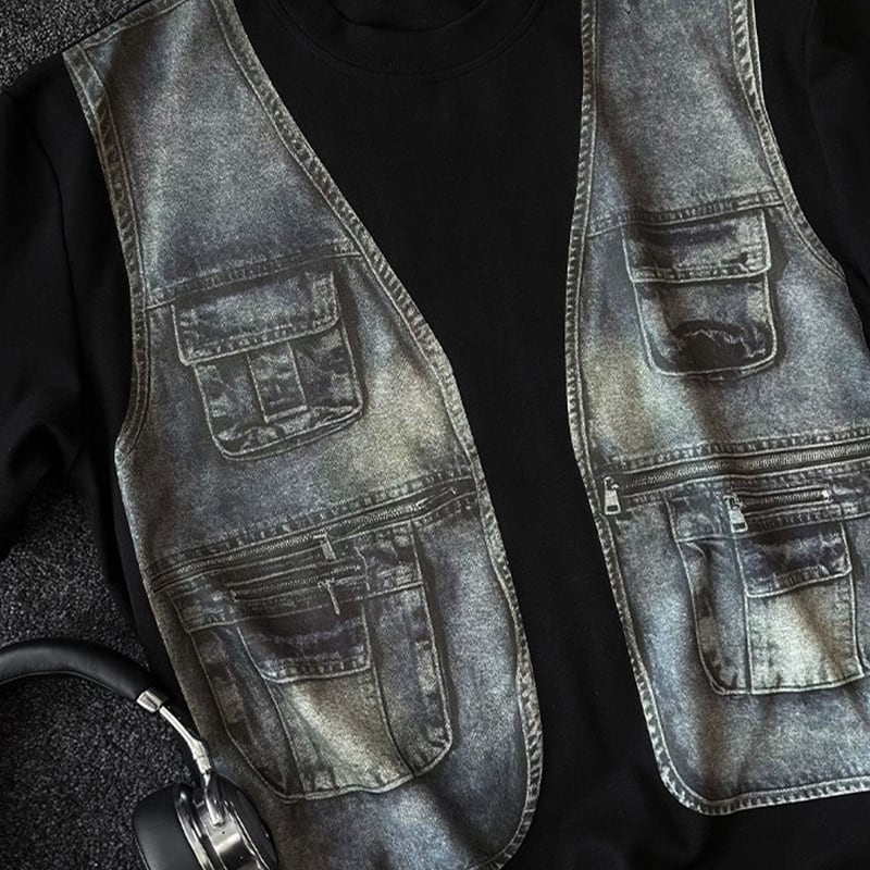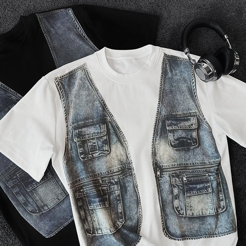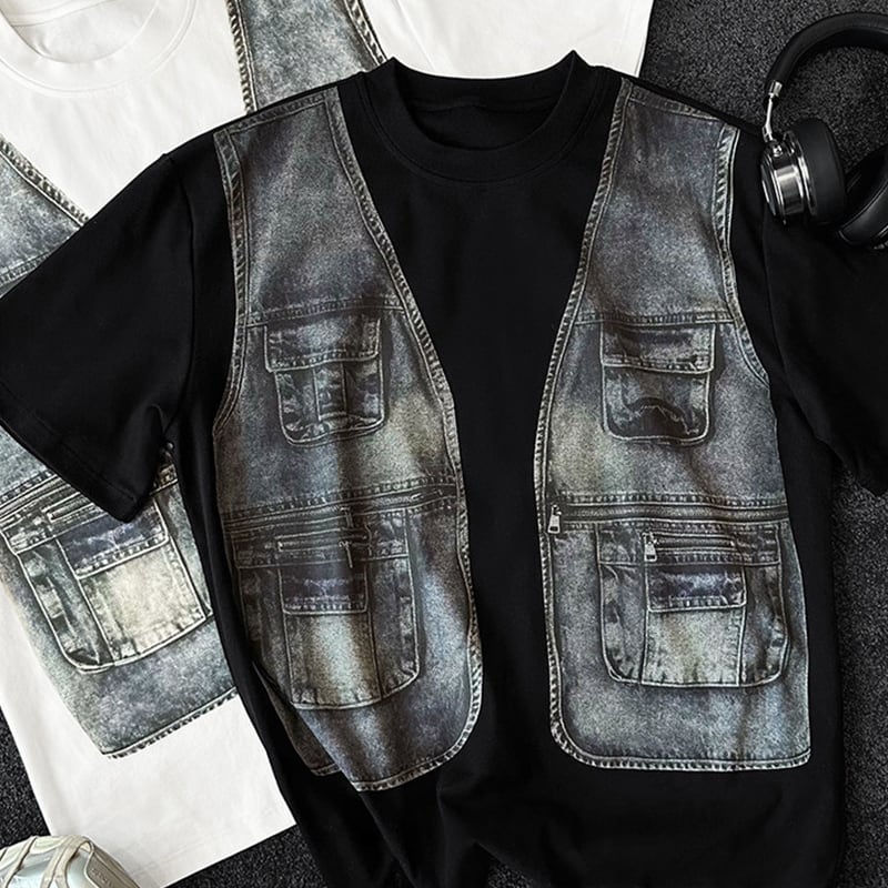 LDDフェイクレイヤードデニムプリント半袖Tシャツ
