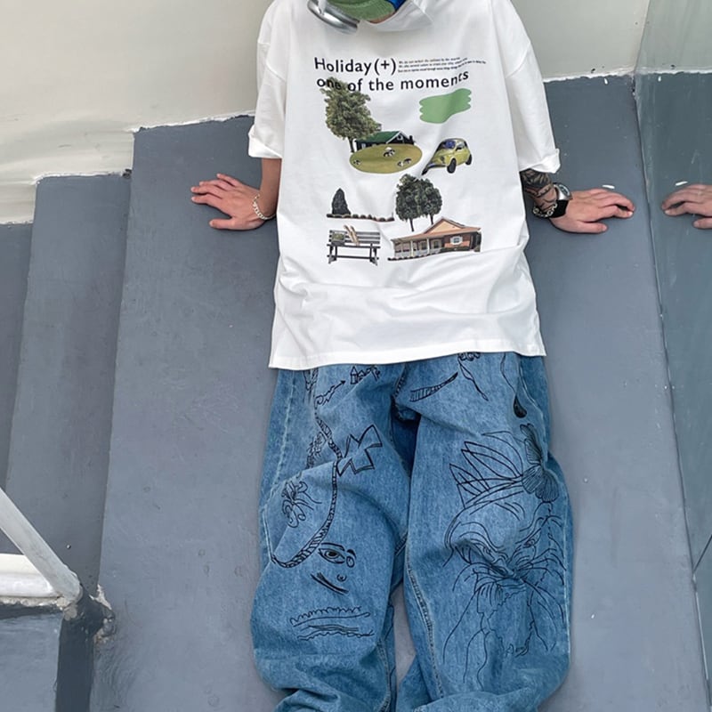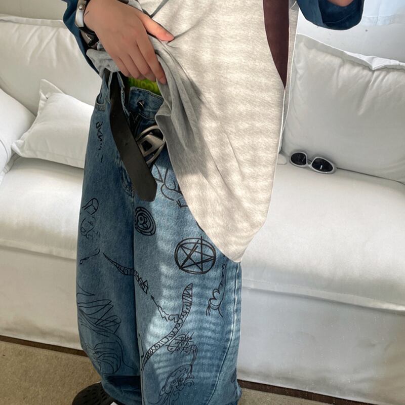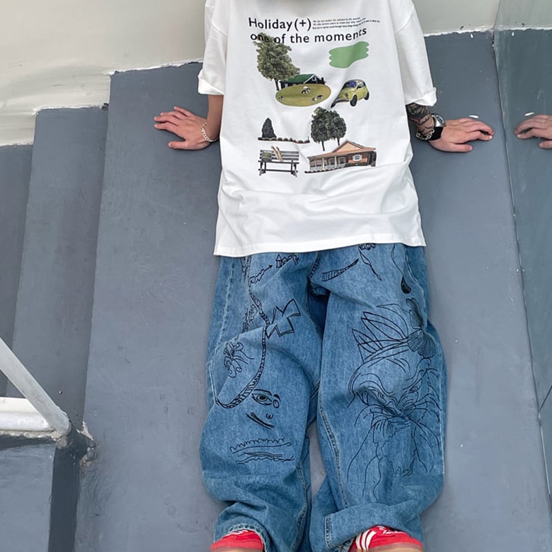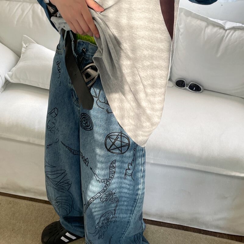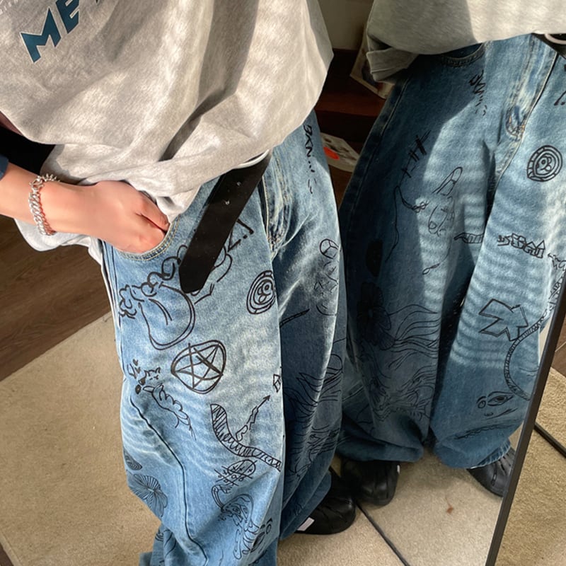 JUSHOUREN古着風落書きデニムパンツ