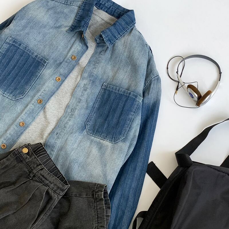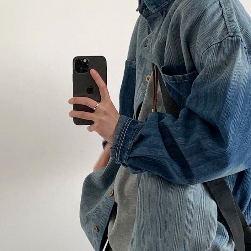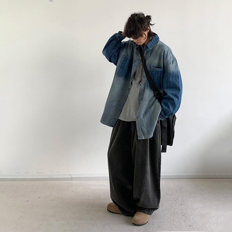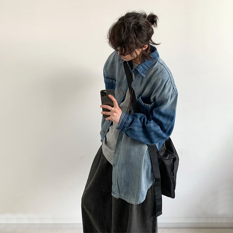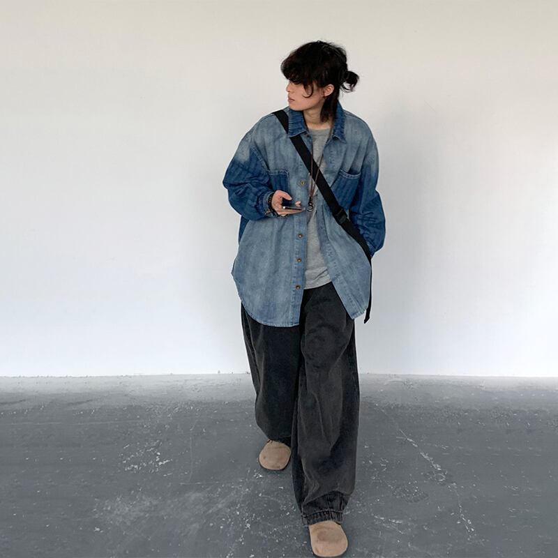 jiwuus藍色グラデーションの長袖デニムシャツ
