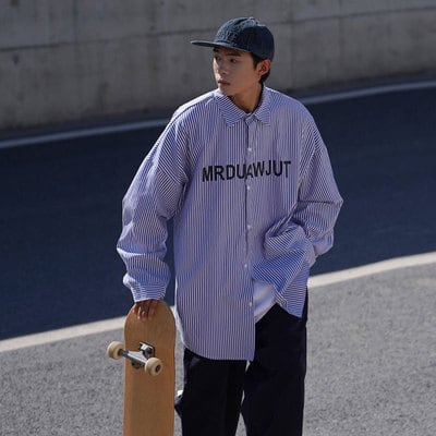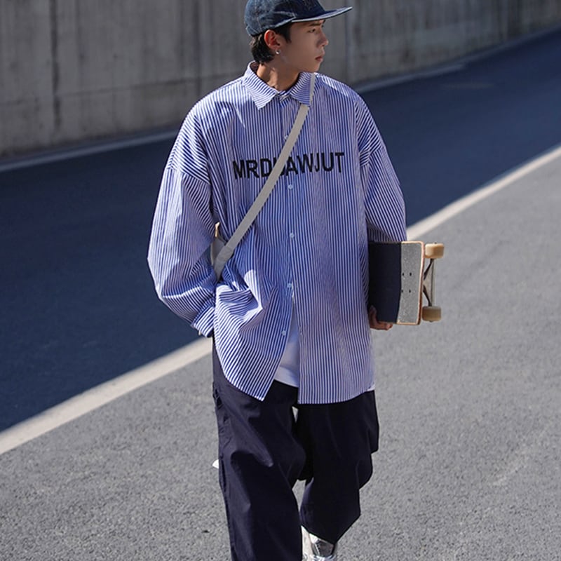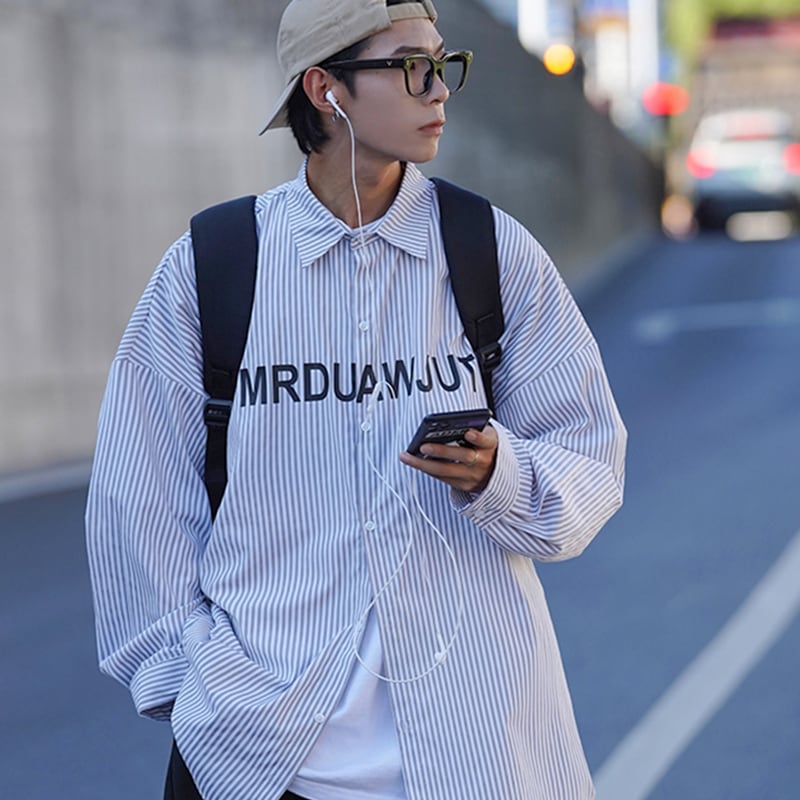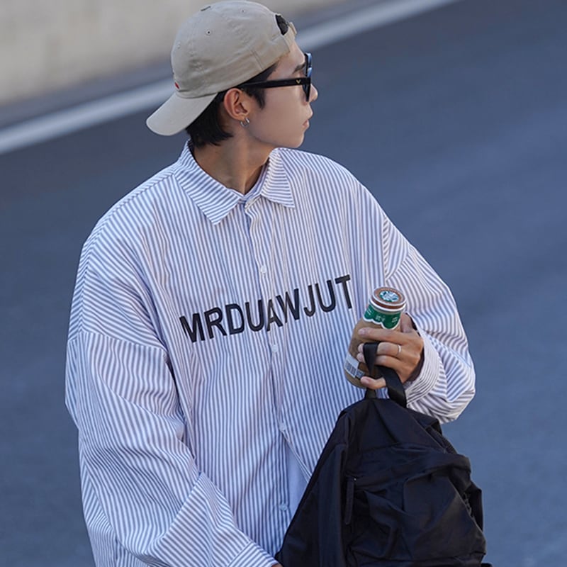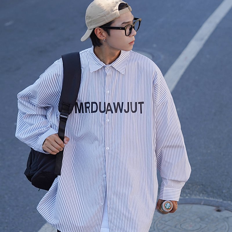 英字デザインのストライプ柄長袖シャツ