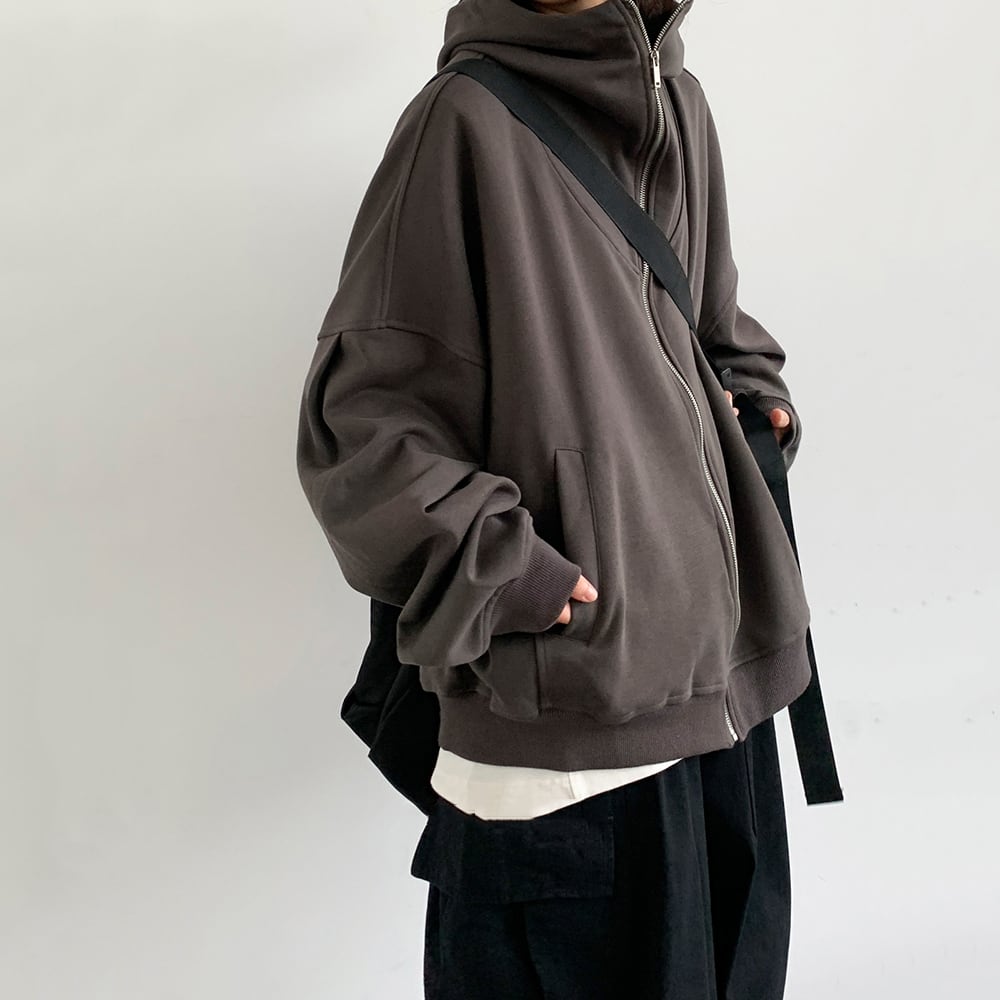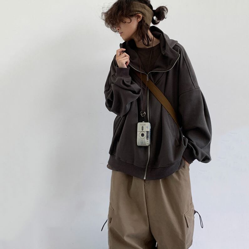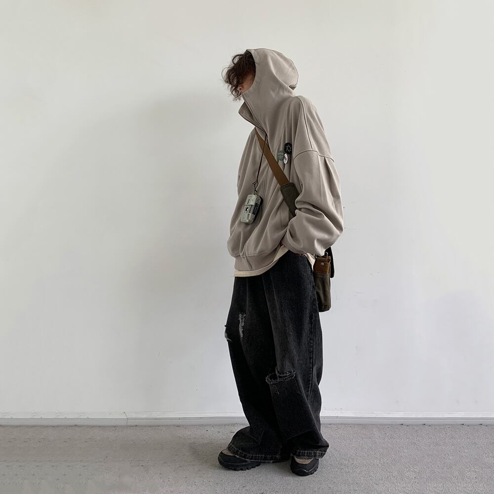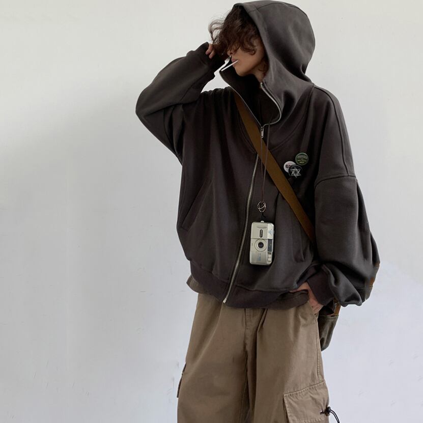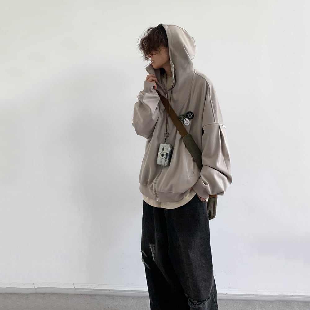 jiwuus学院風バッジ付きジップアップパーカー
