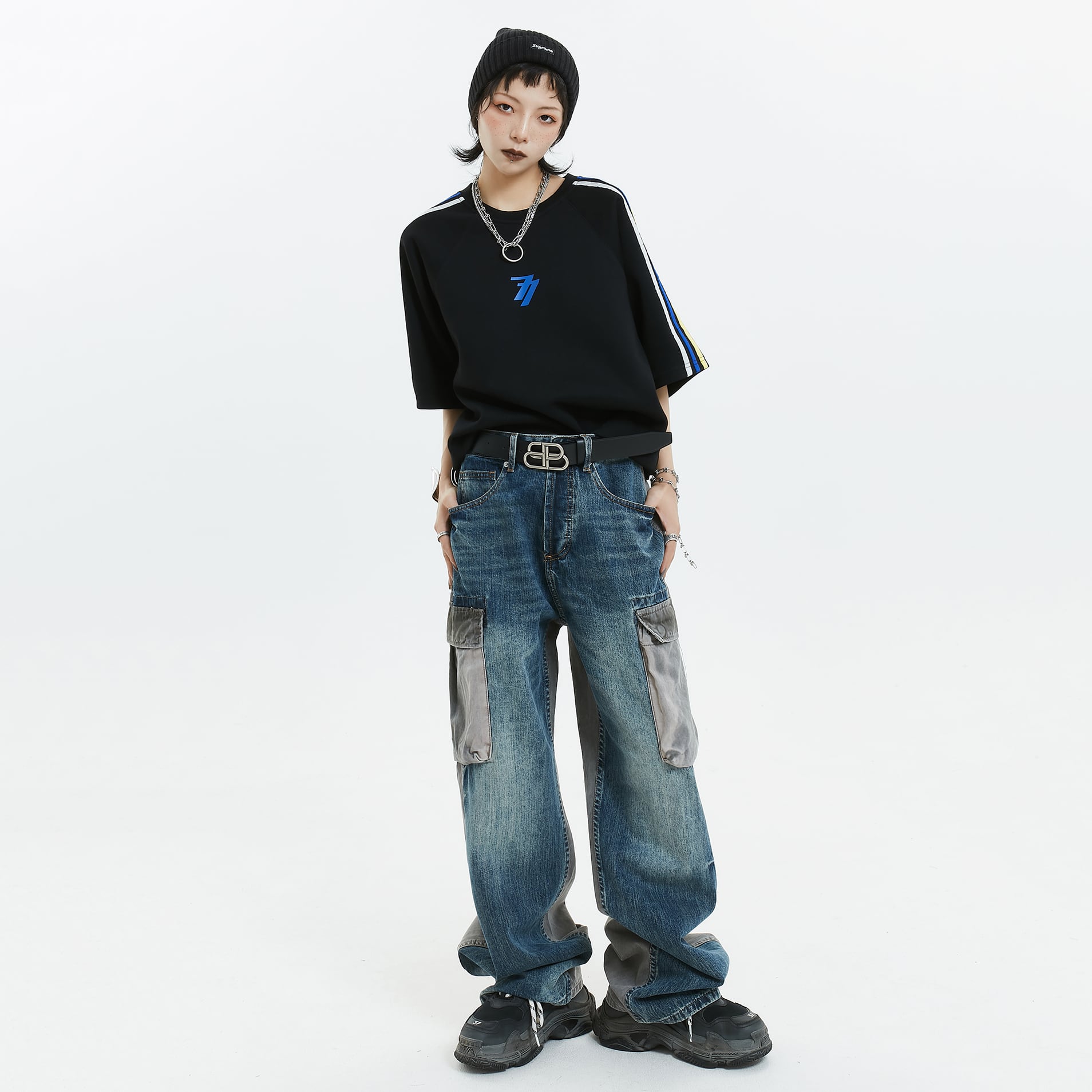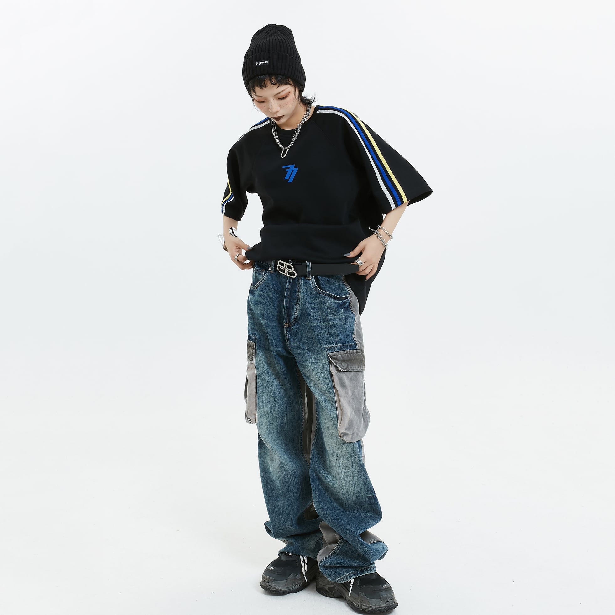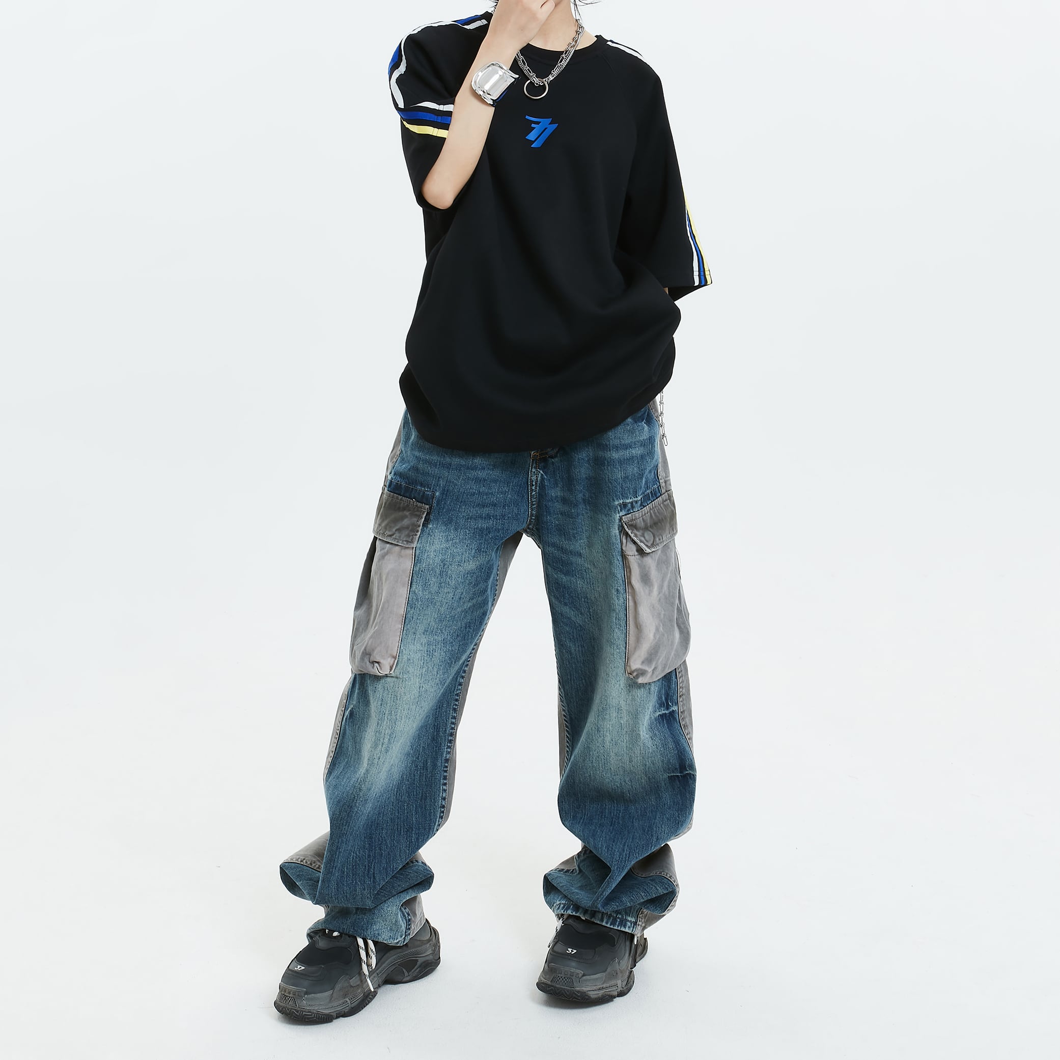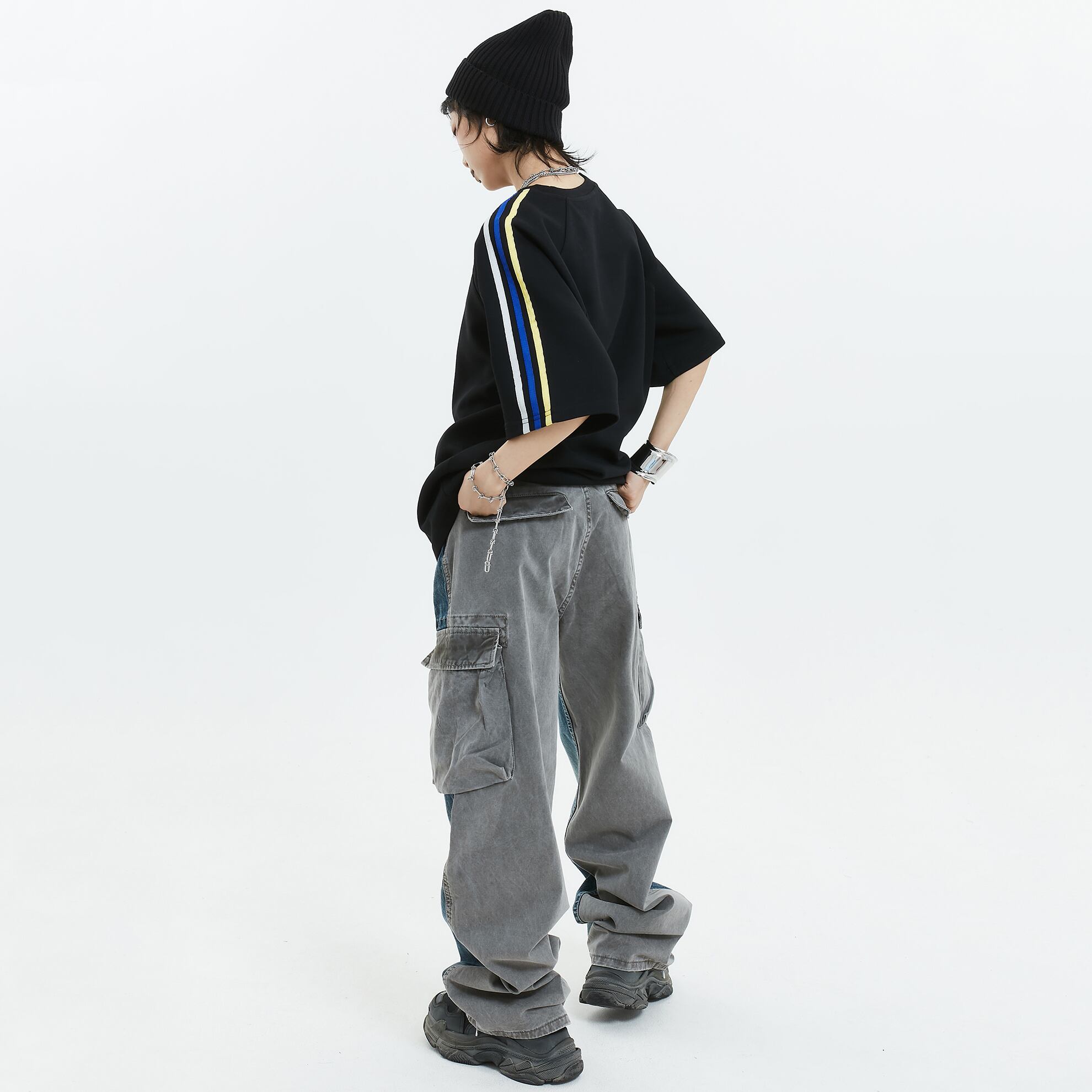 MICHINYON前後色違いデニムカーゴパンツ