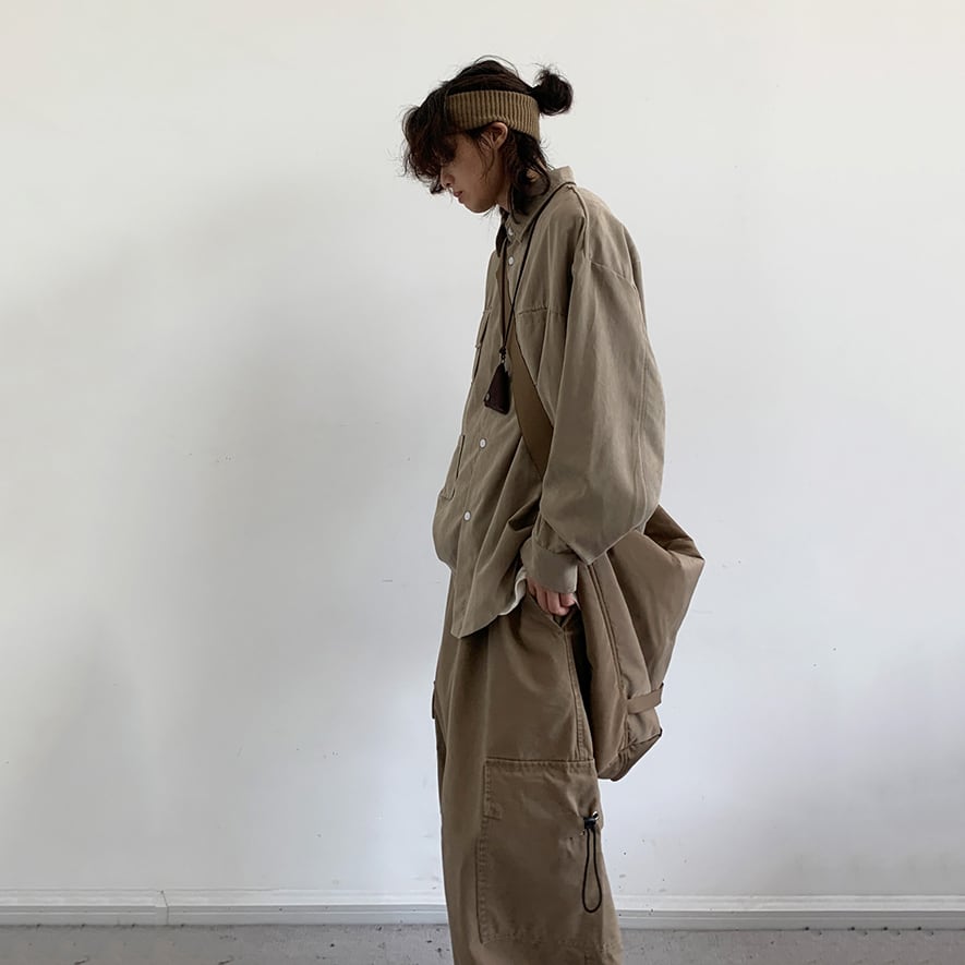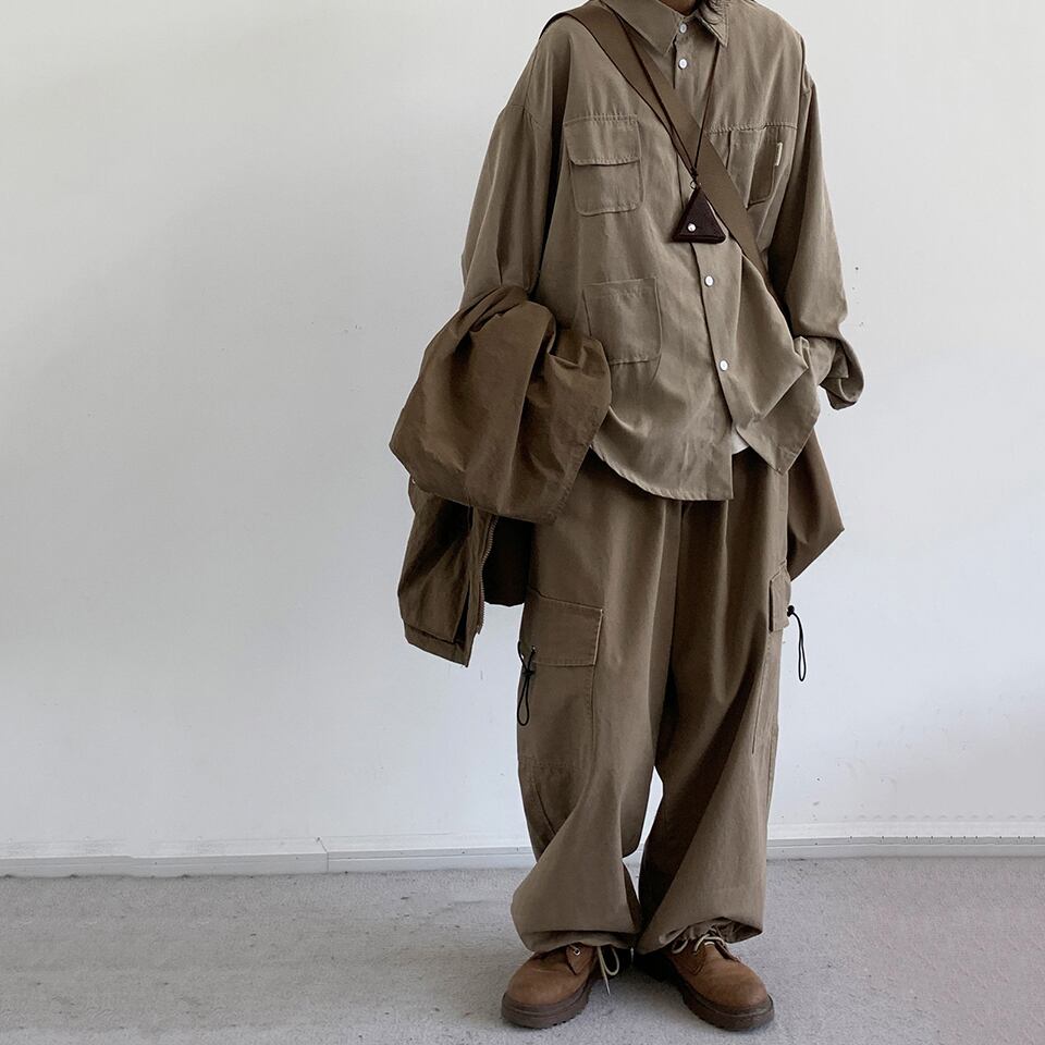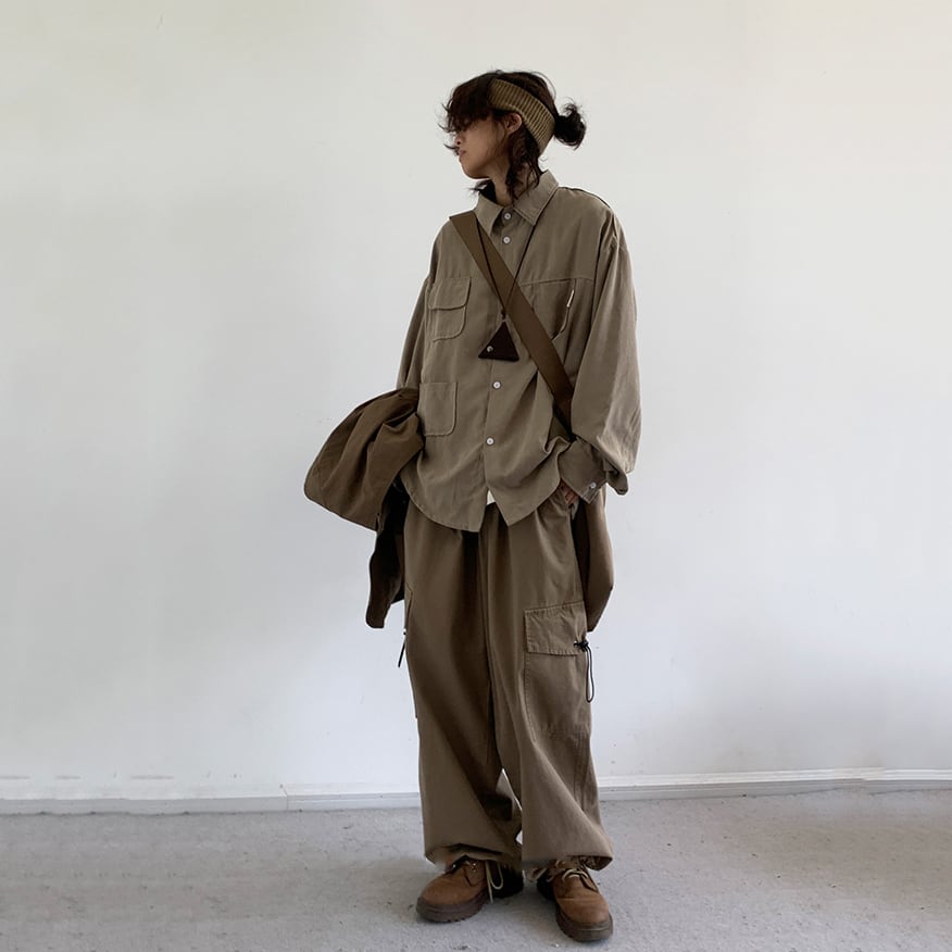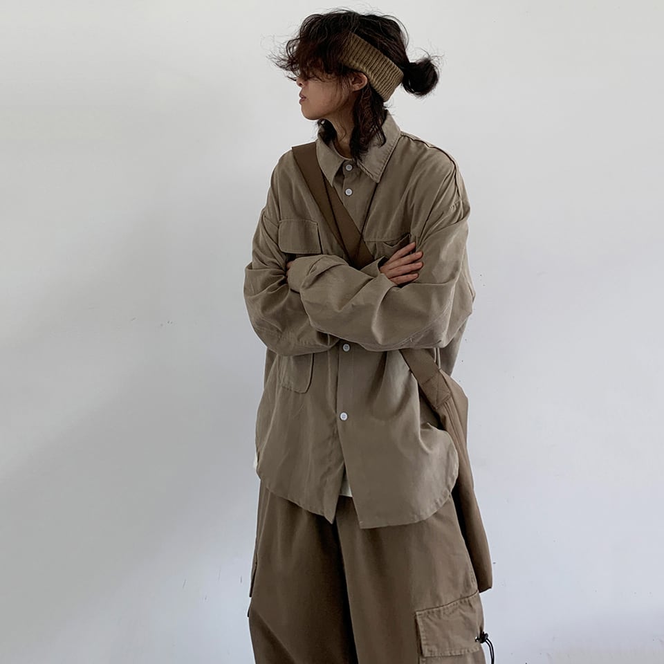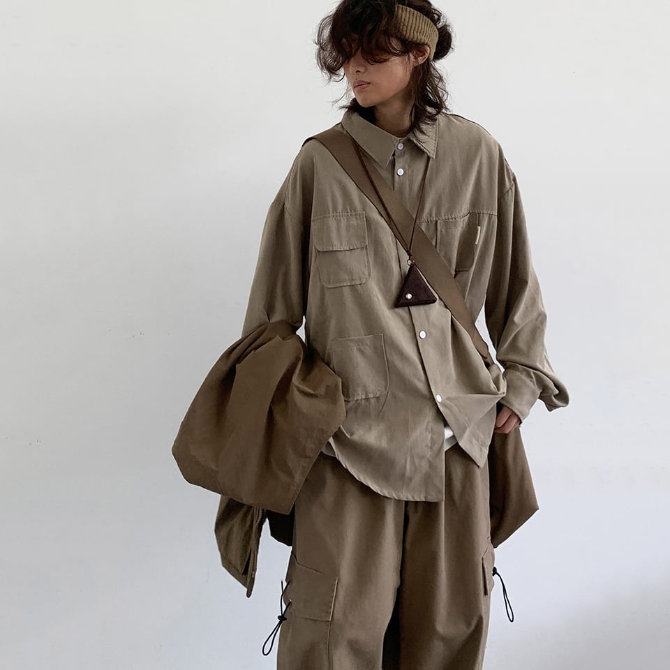 Jiwuus薄茶色の多ポケット付長袖シャツ