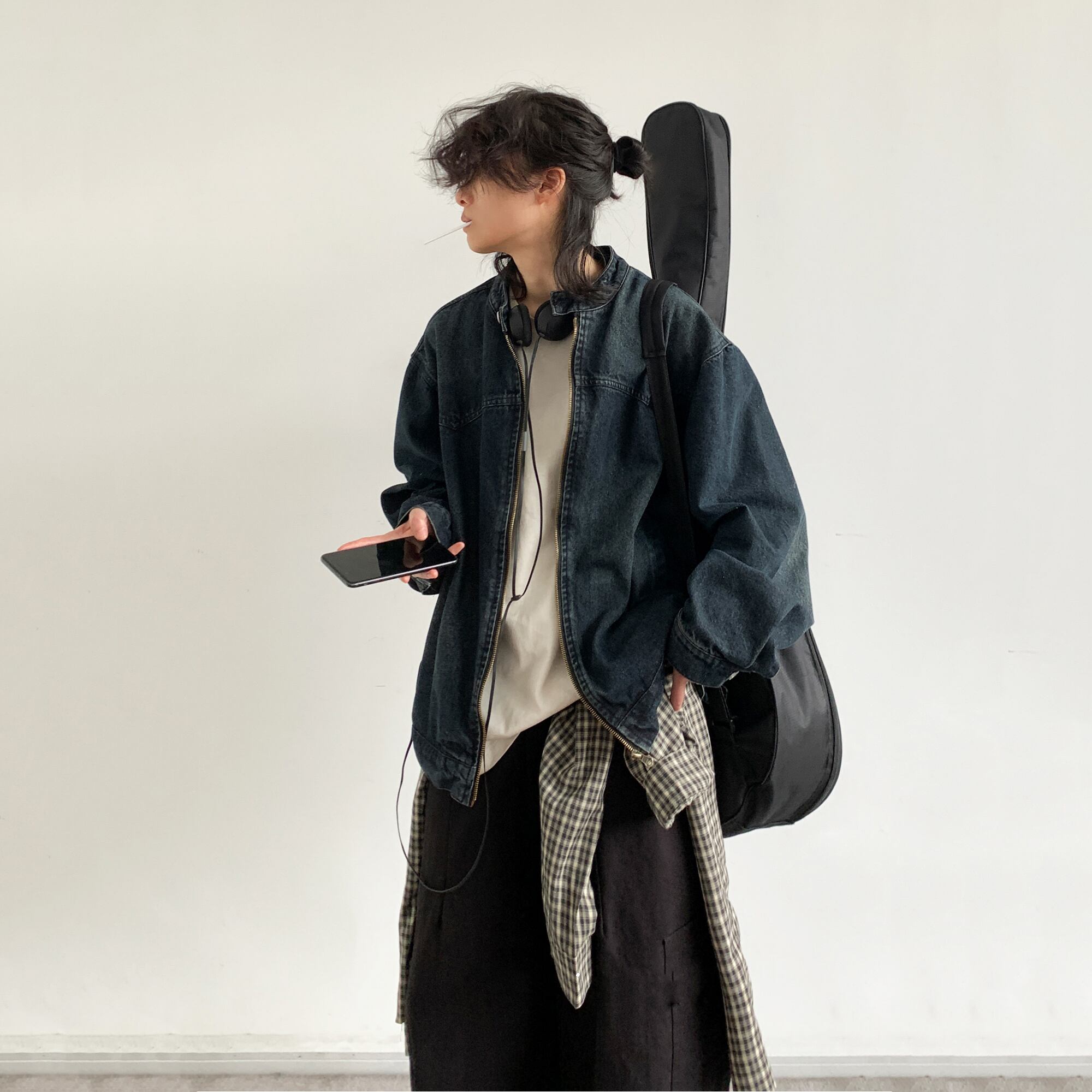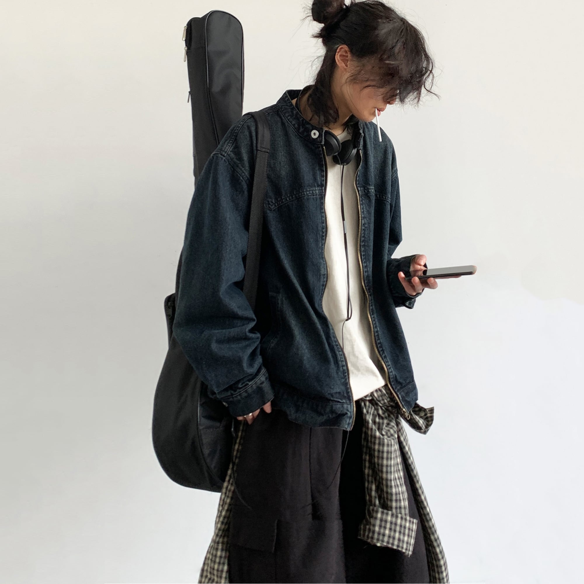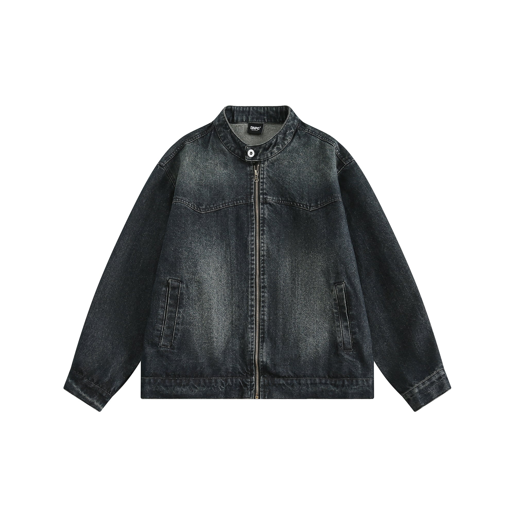 jiwuus紺青色ジップアップデニムジャケット