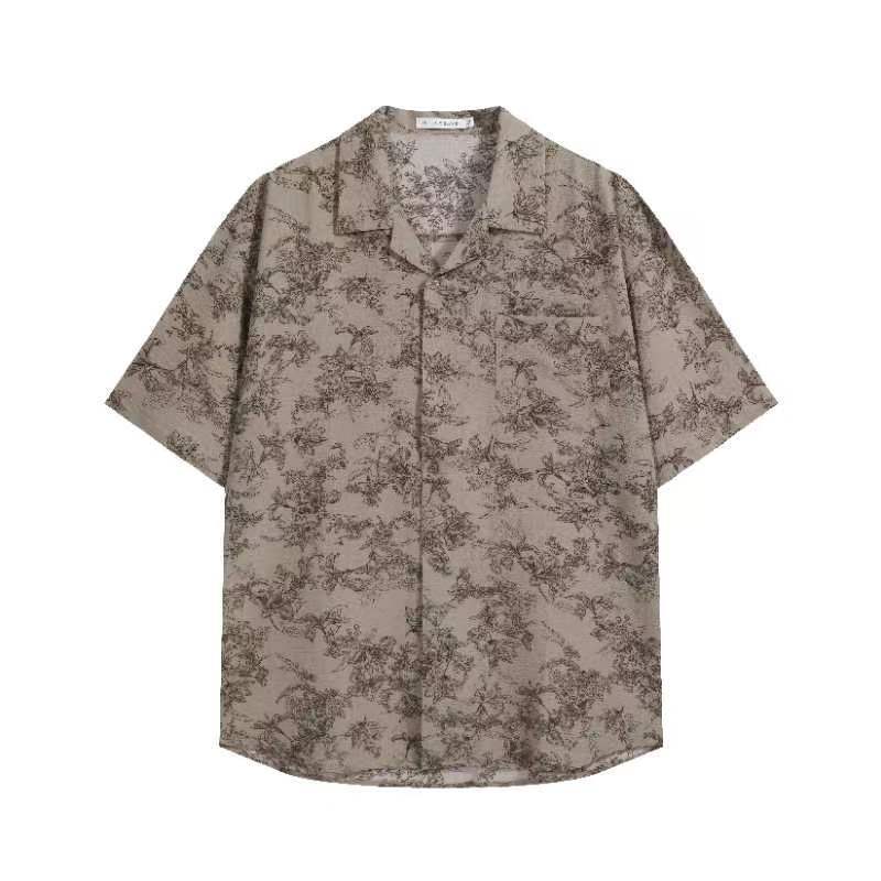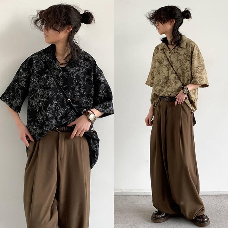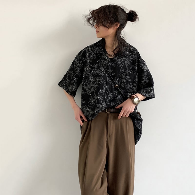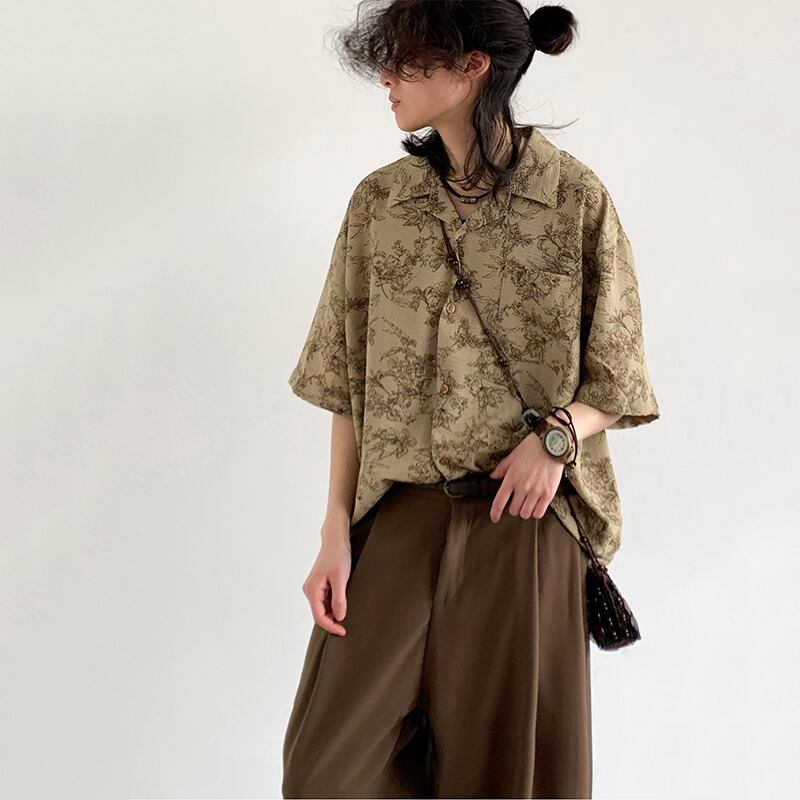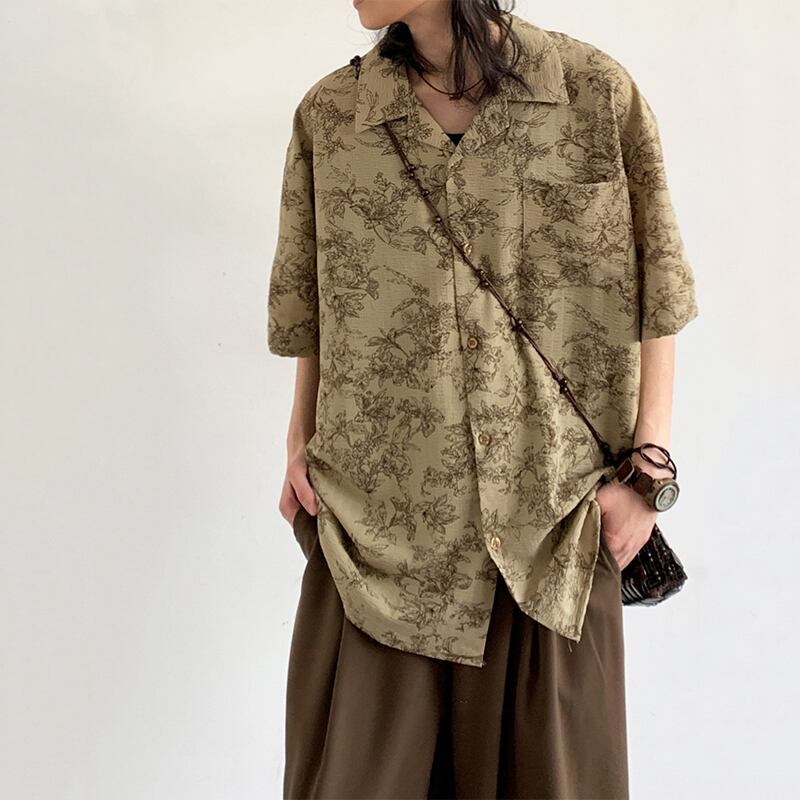 jiwuusレトロ花模様キューバシャツ