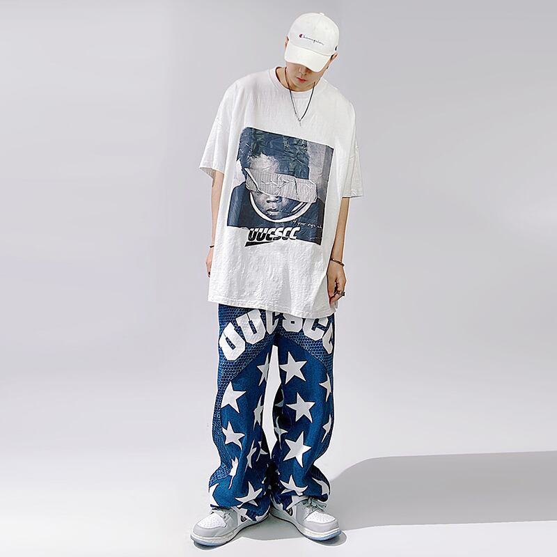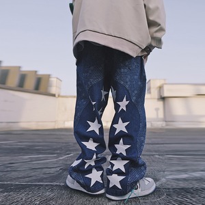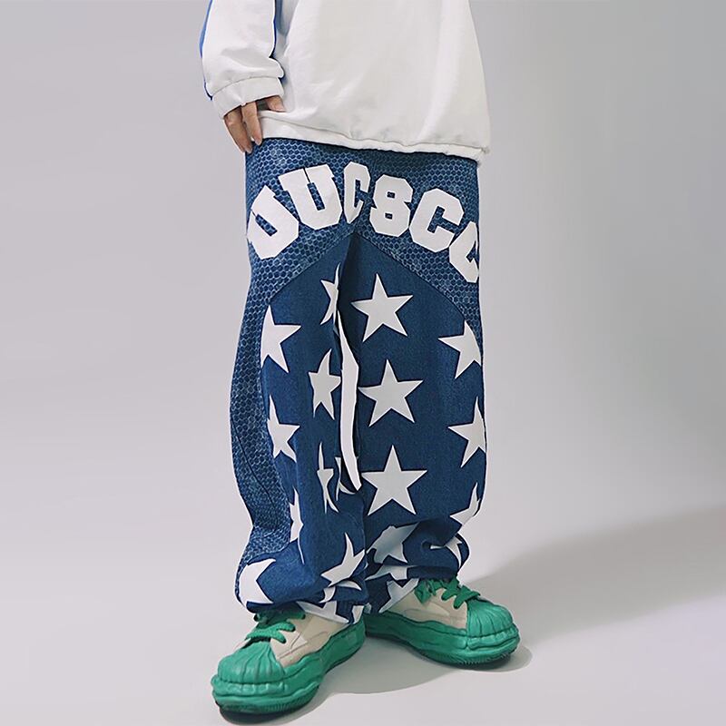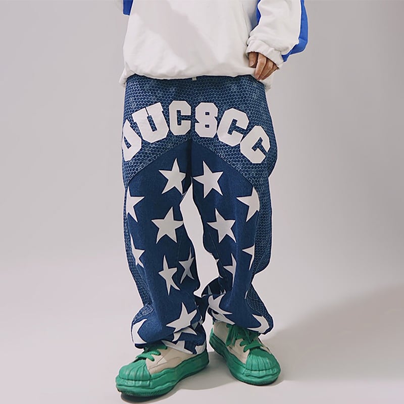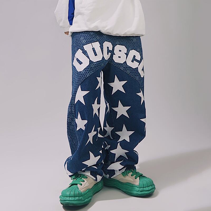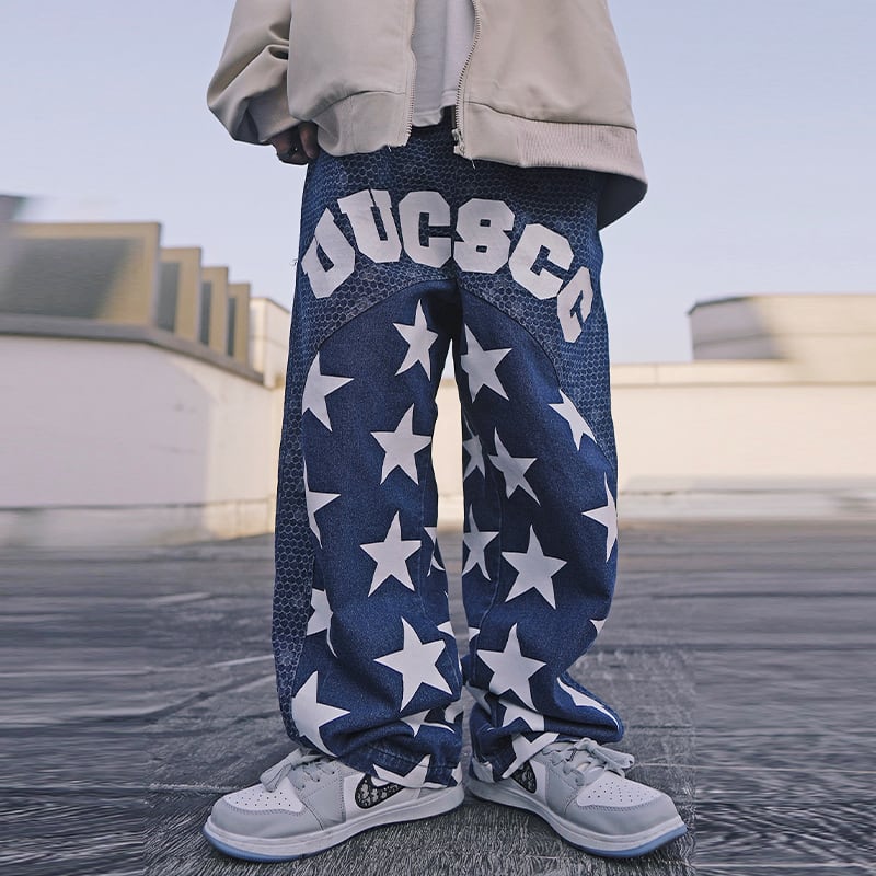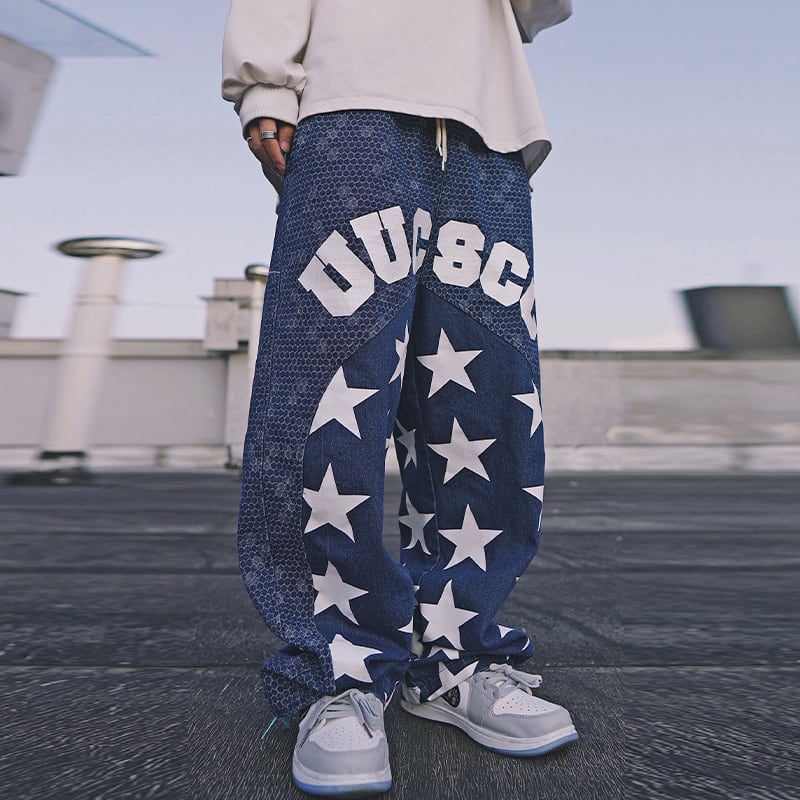 UUCSCC藍色の星柄デニムストレートパンツ