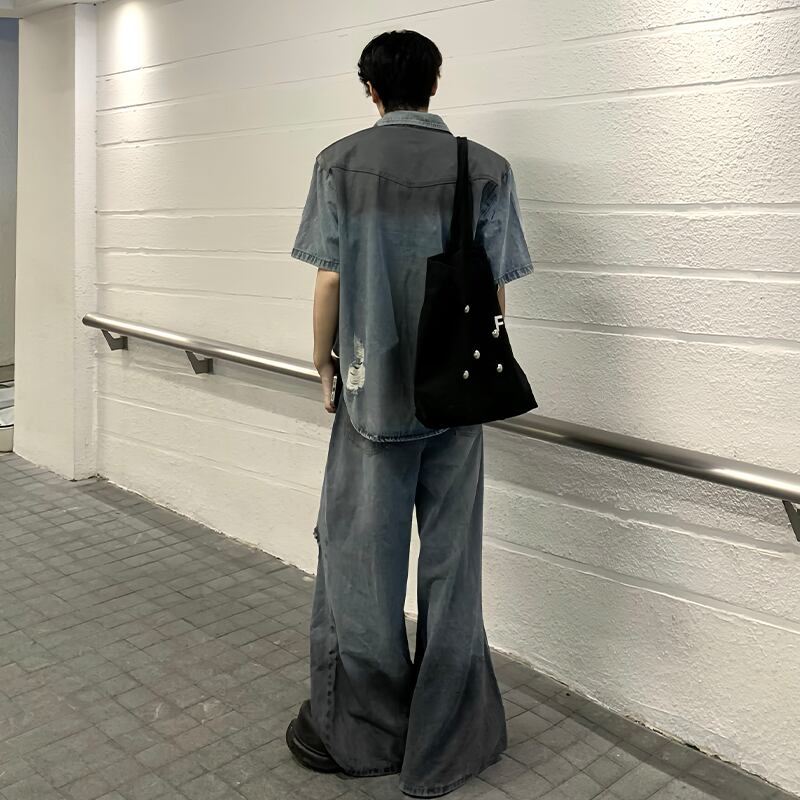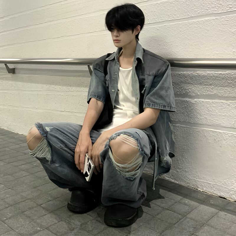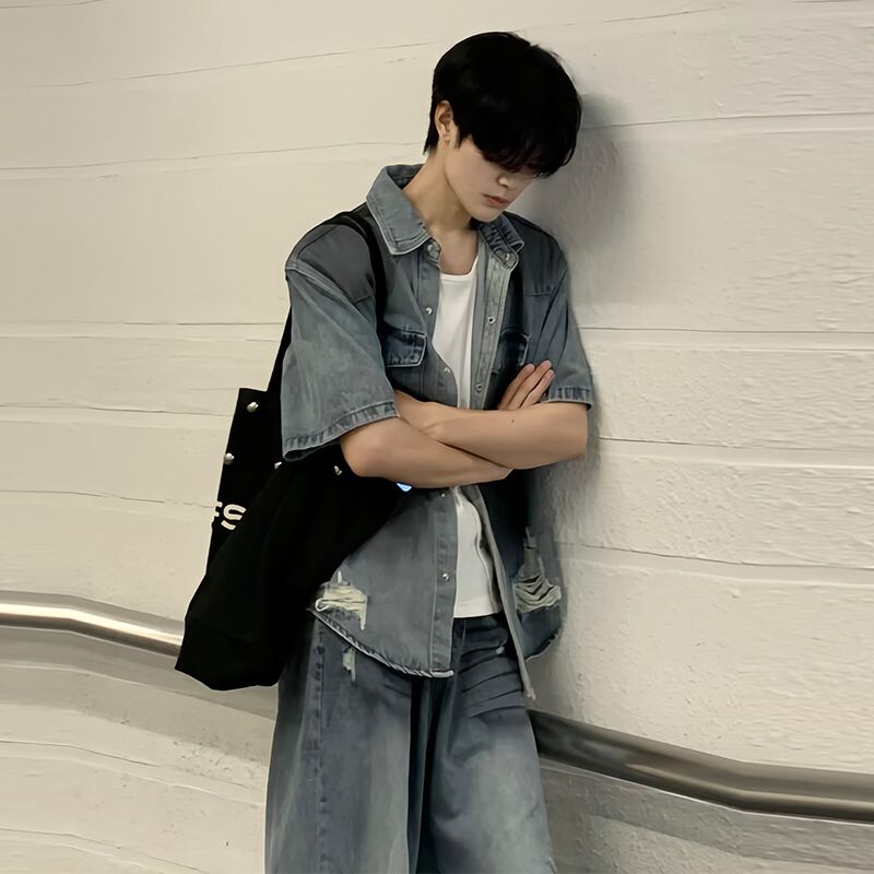 ONE Lilacfishダメージ加工デニム半袖シャツ