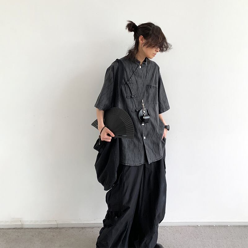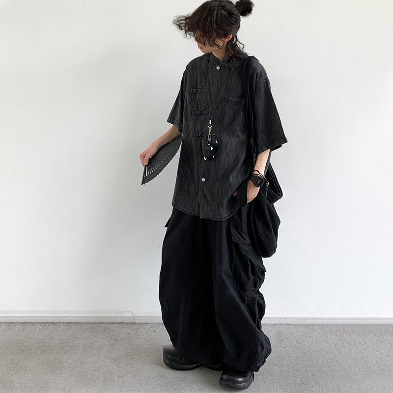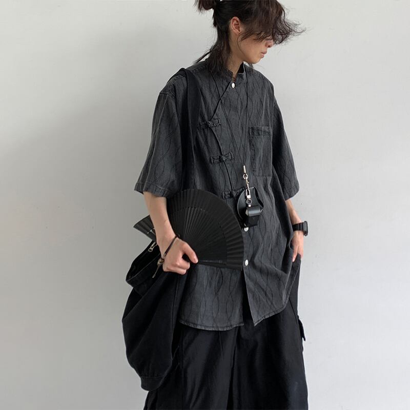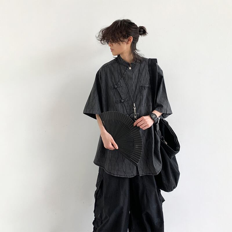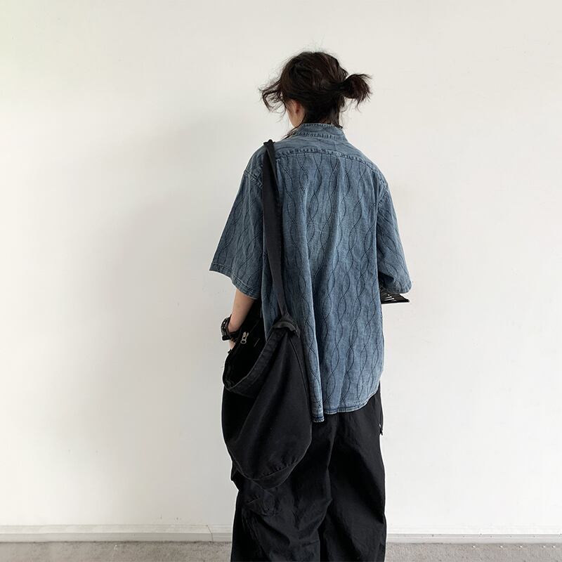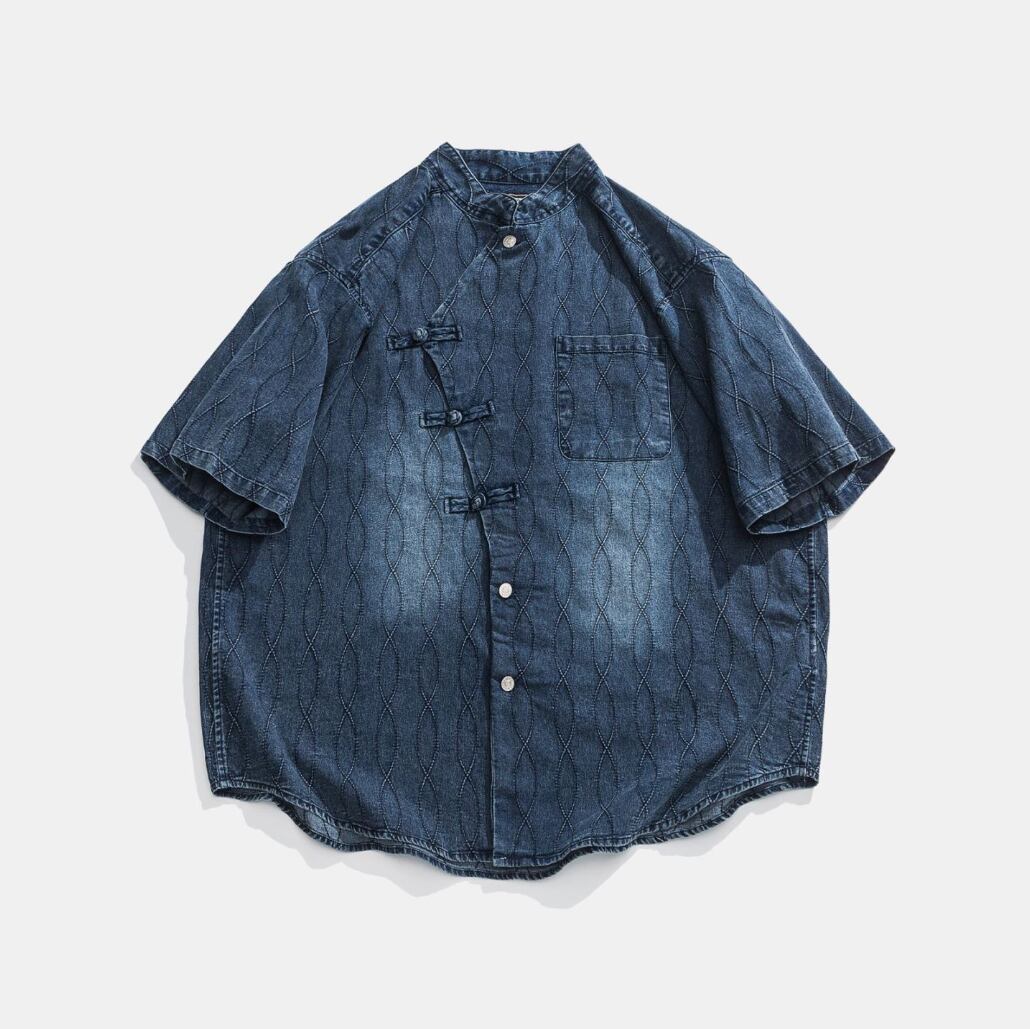 jiwuusレトロ斜め襟デニム半袖シャツ