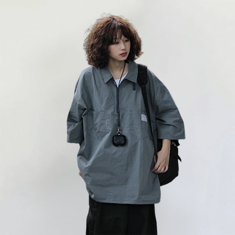 AFISHSTAY灰色ハーフジップ半袖シャツ