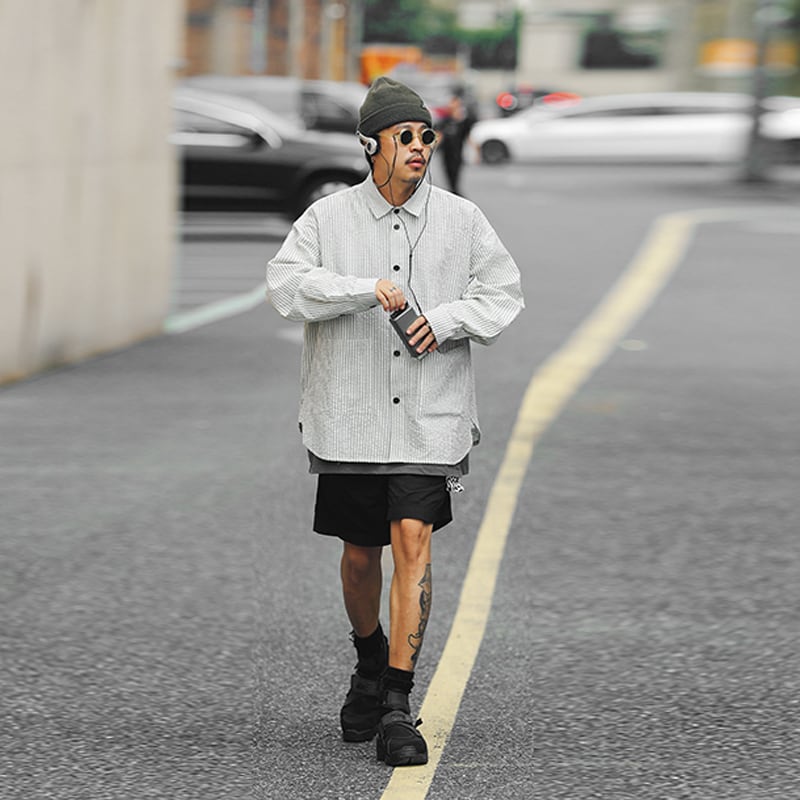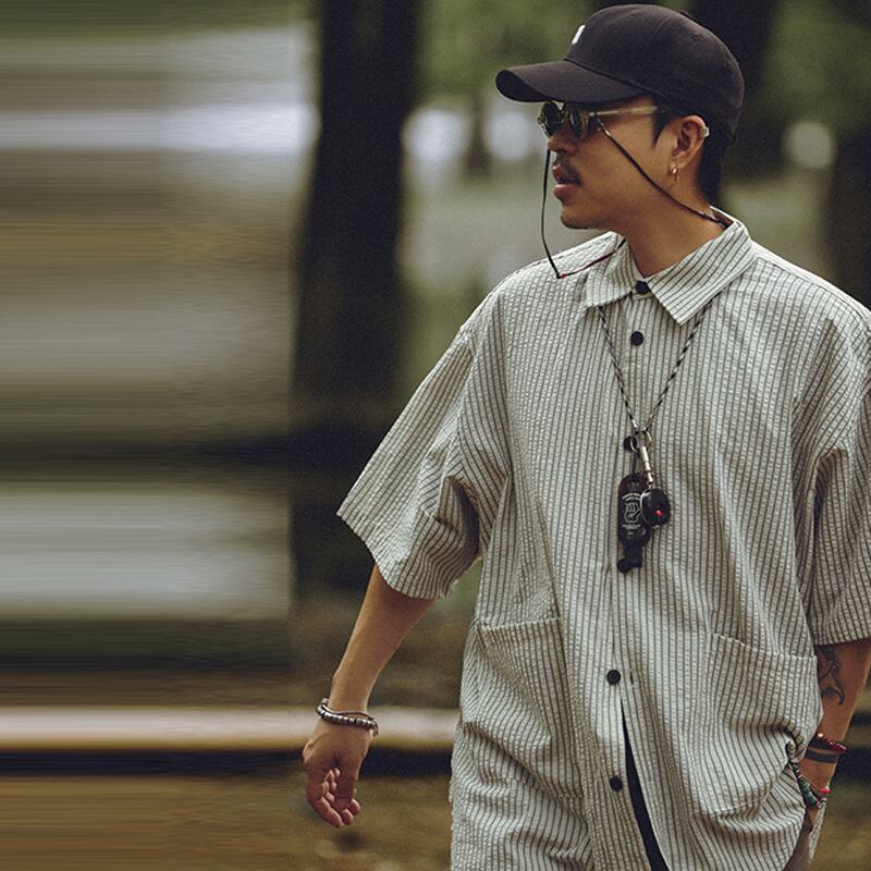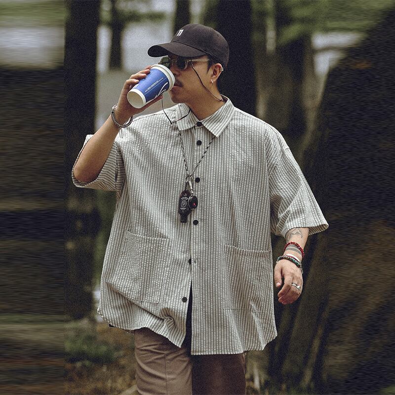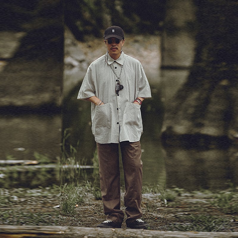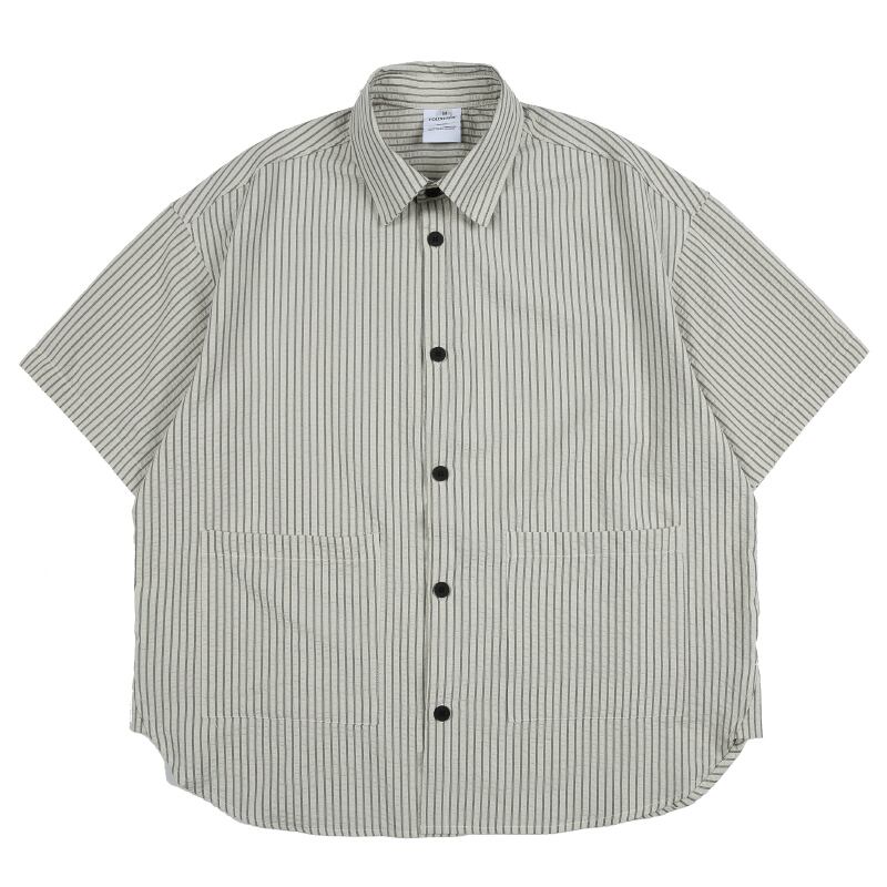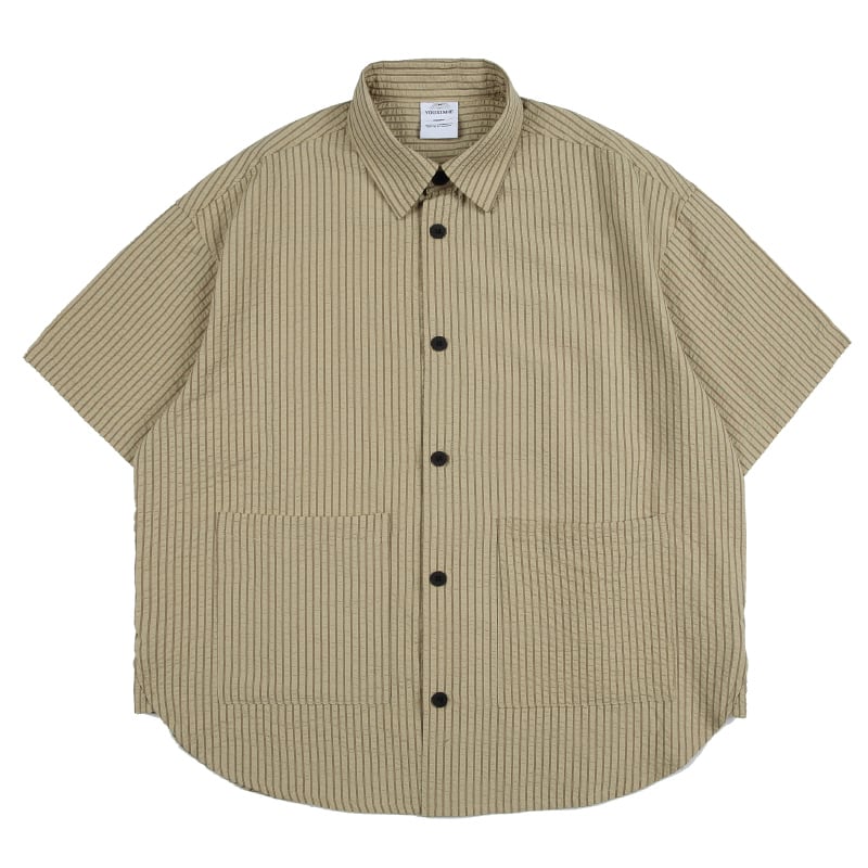 OllieSnap全3色縦縞模様ポケット付き半袖シャツ