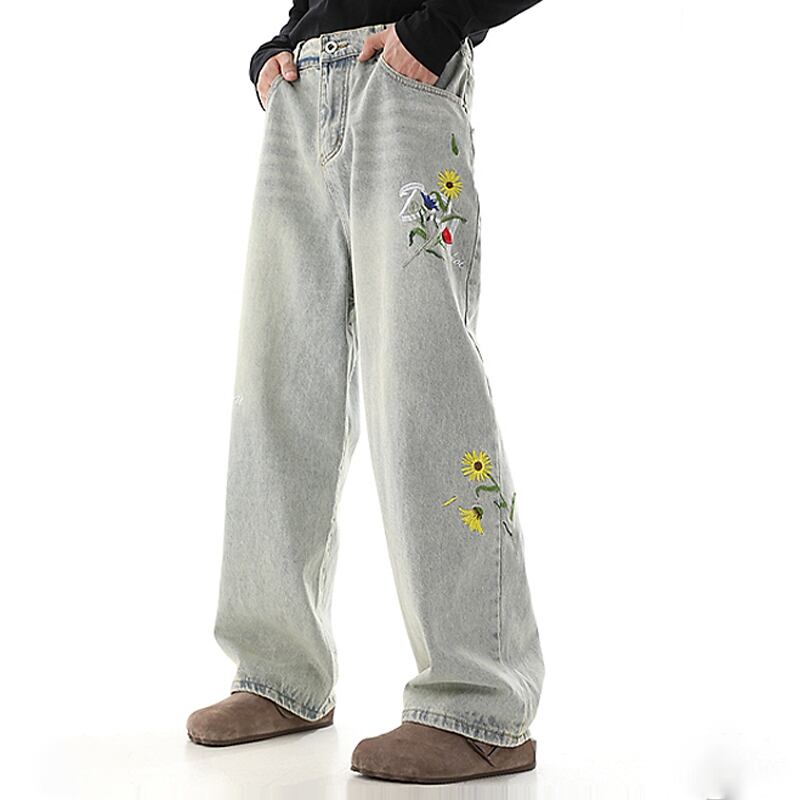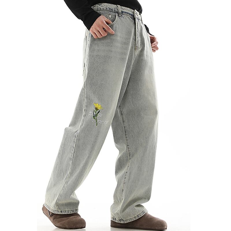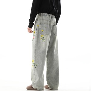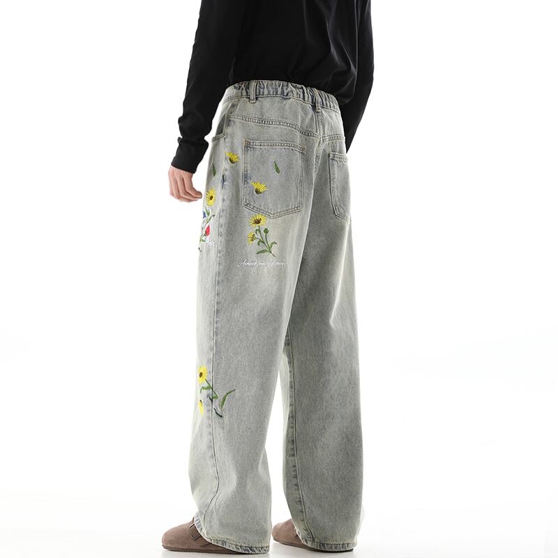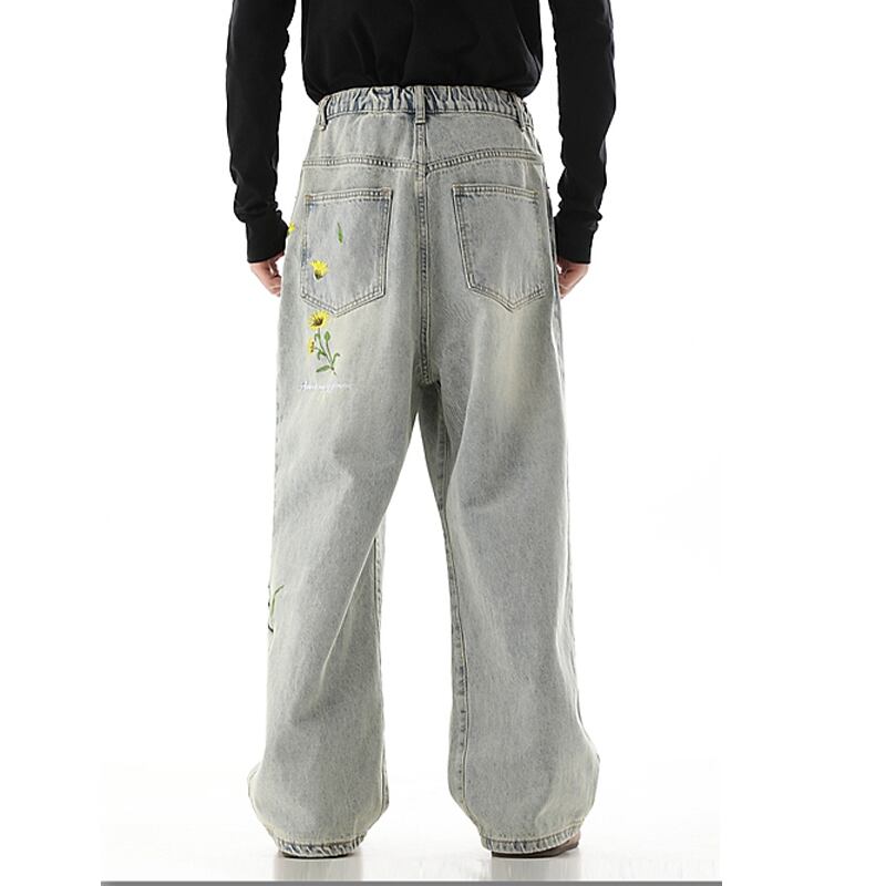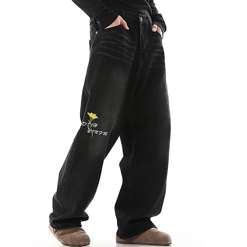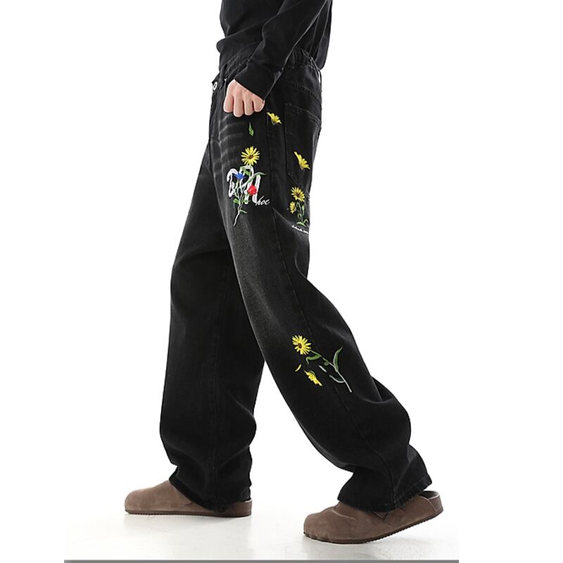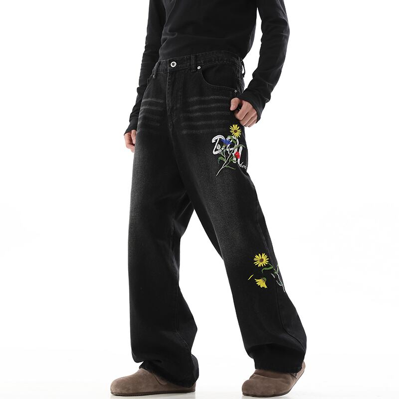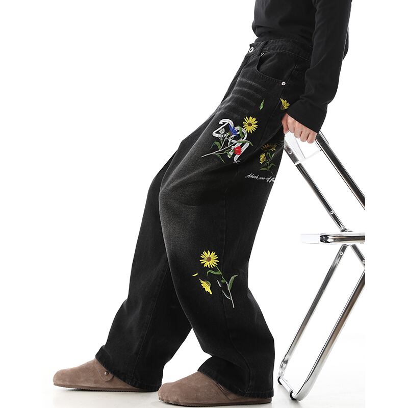 黒灰色デイジー刺繡入りデニムパンツ
