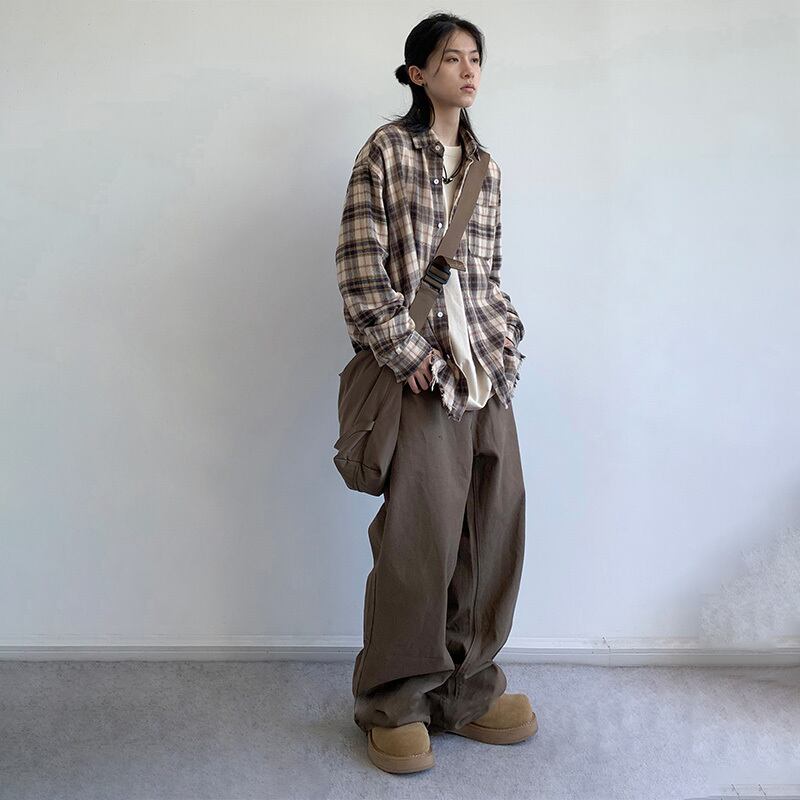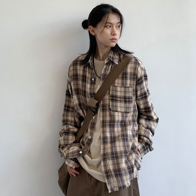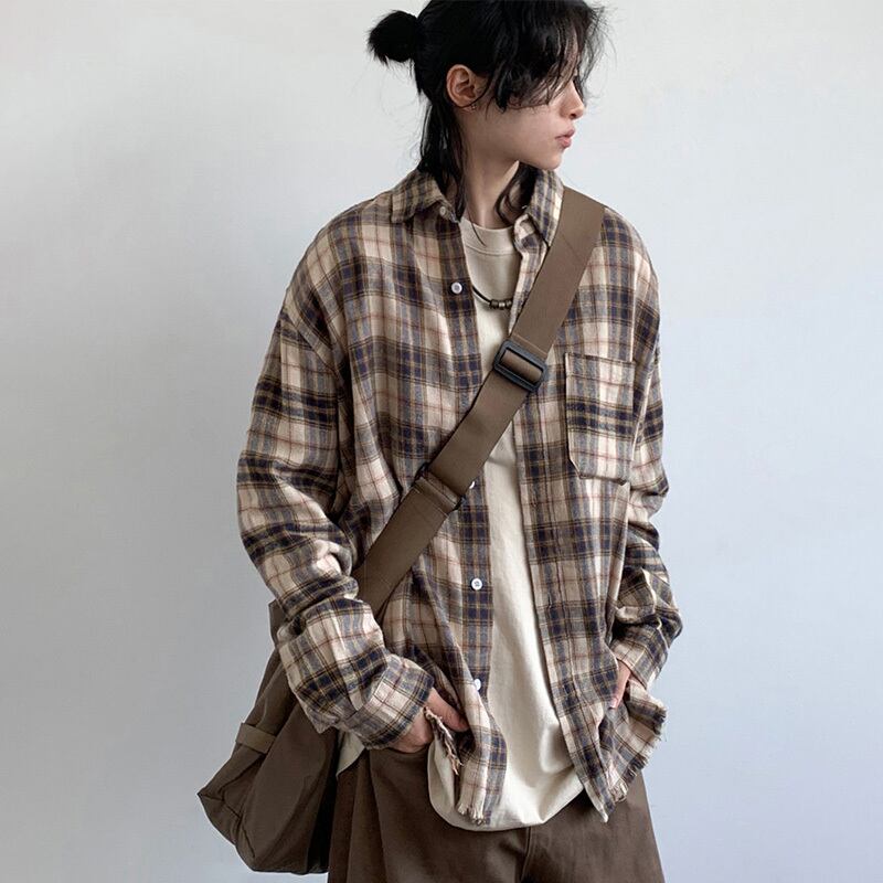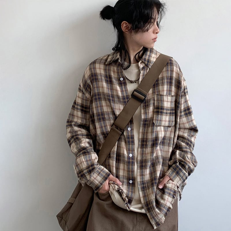 jiwuus茶色ベーシック格子柄長袖シャツ【M0060】