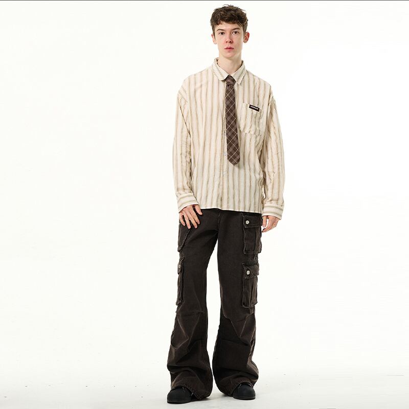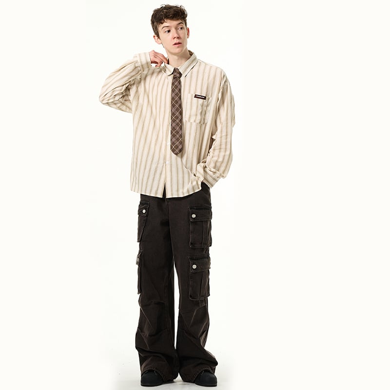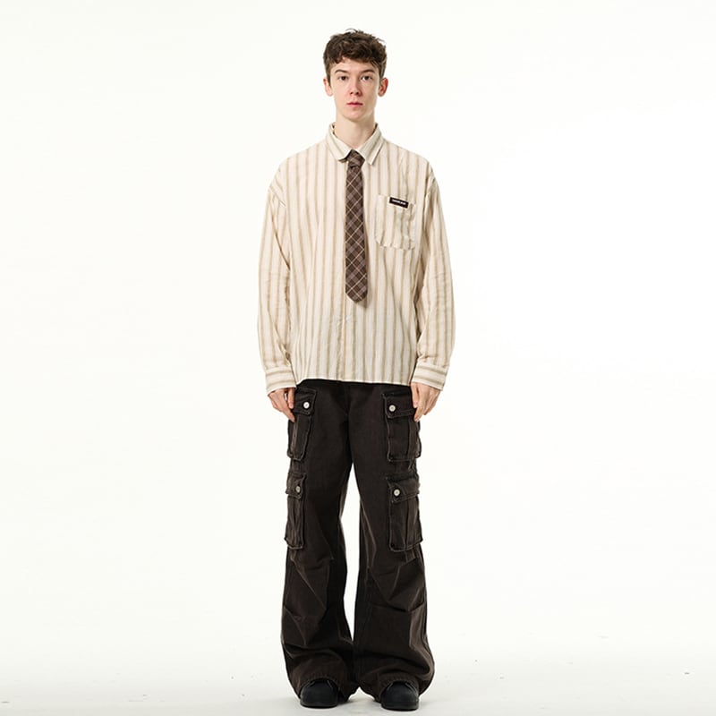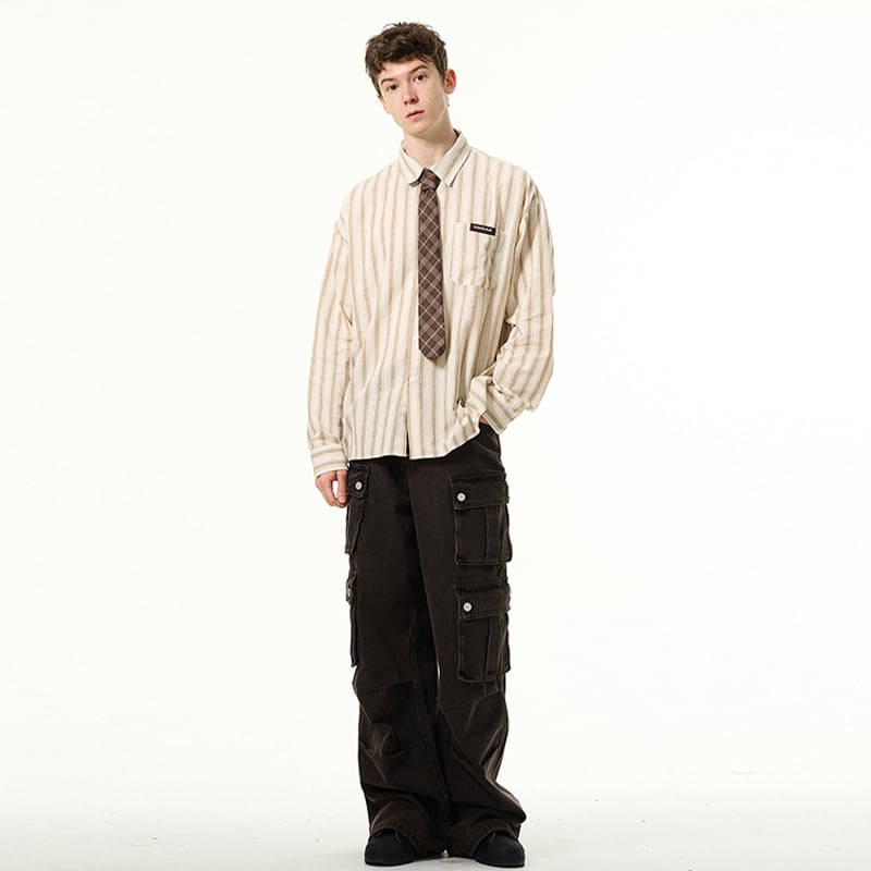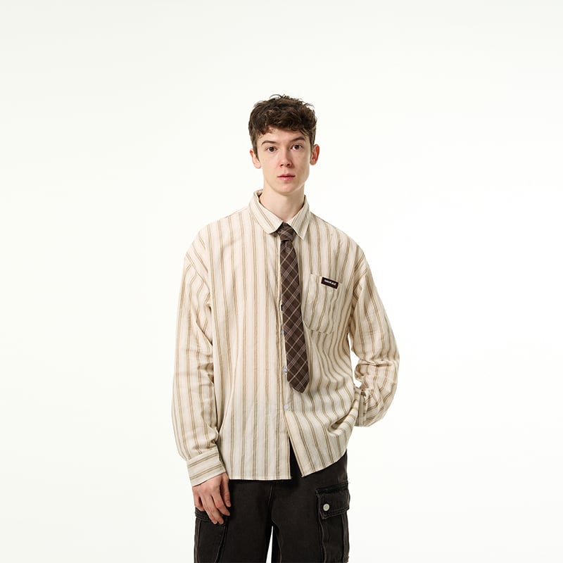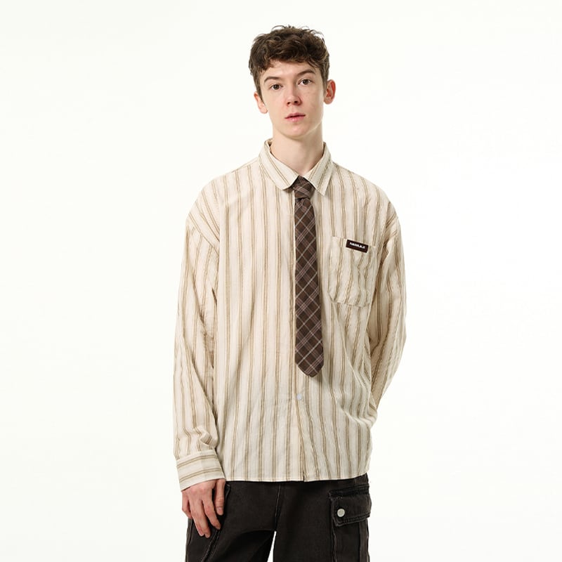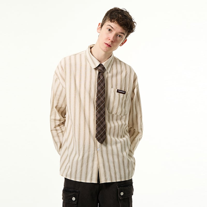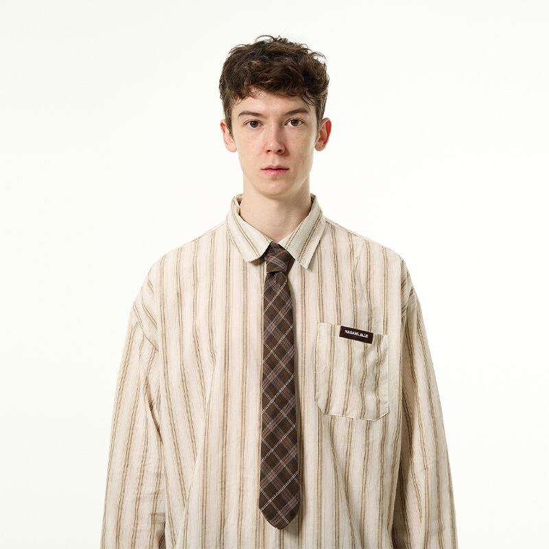 MADWITCH白茶色ストライプ柄ネクタイ付きシャツ