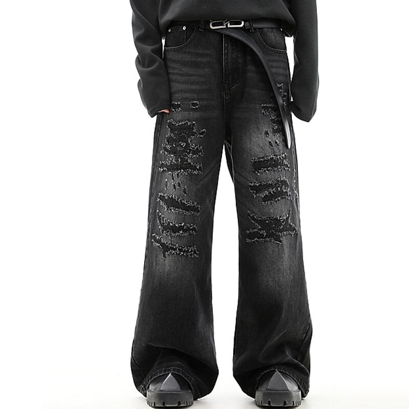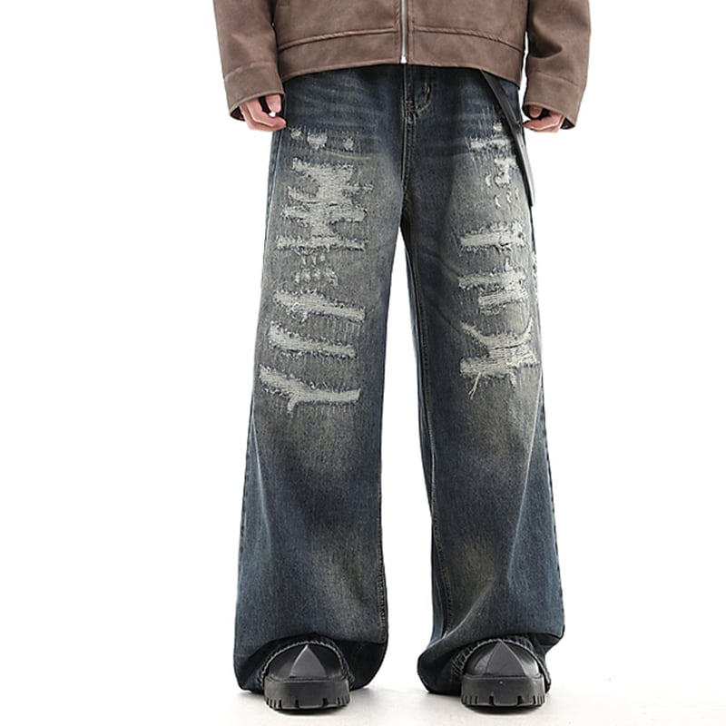 Trend st全2色ヴィンテージ加工ダメージバギーデニムパンツ