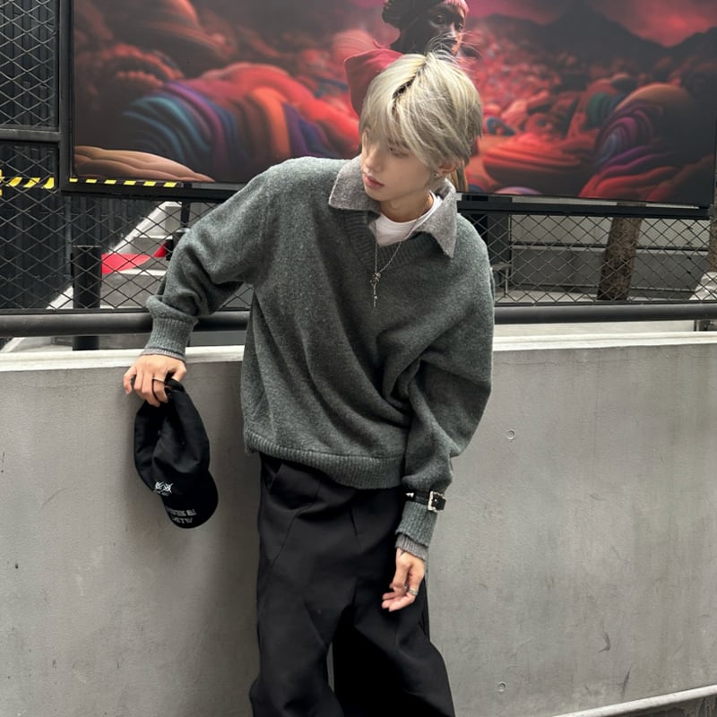 RTIMFDフェイクレイヤードVネック襟付きセーター